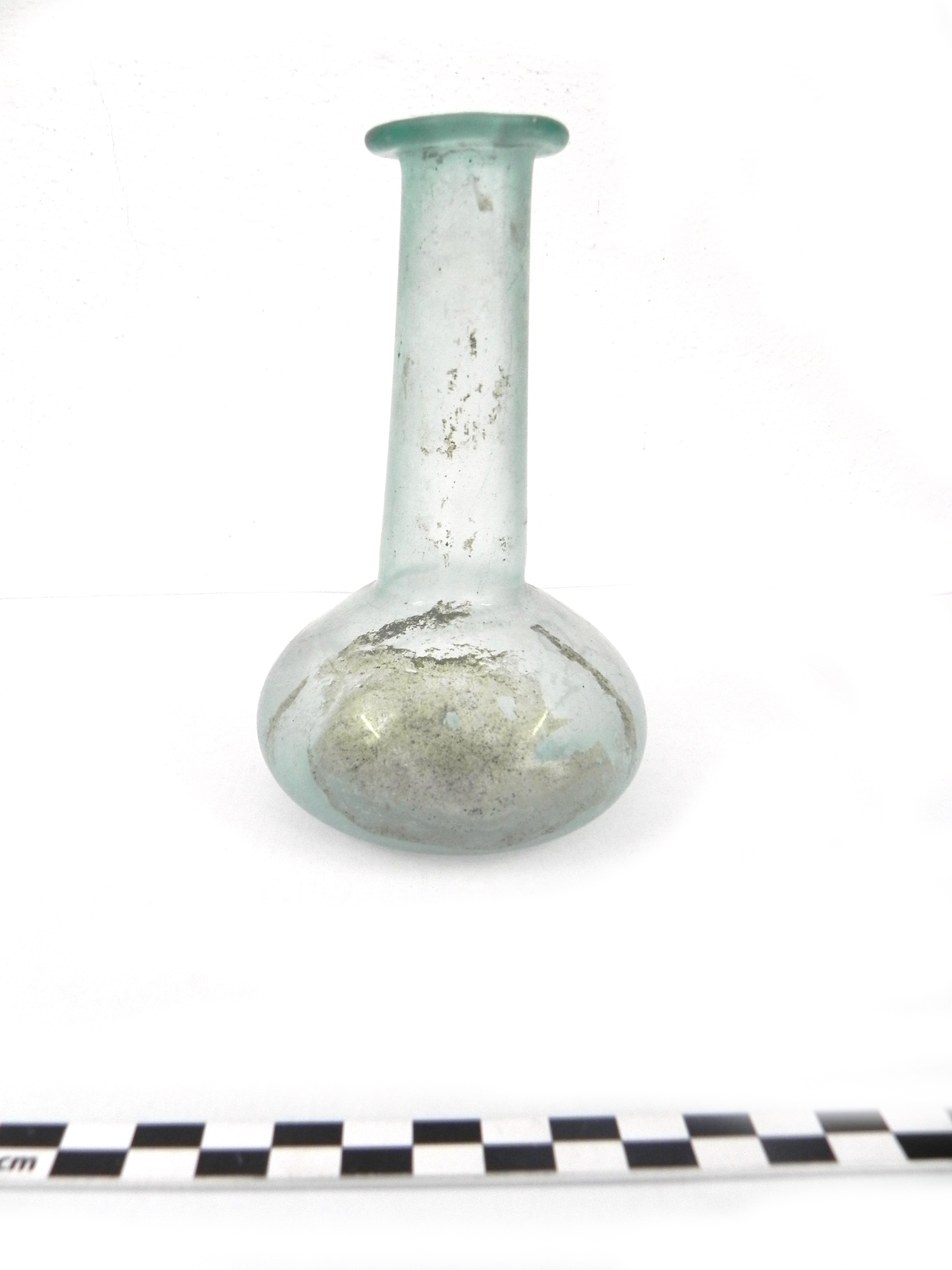 Labbro piatto, tagliato e ripiegato a cordoncino, lungo collo cilindrico con lievissima strozzatura alla base, corpo emisferico schiacciato, fondo leggermente cavo. Vetro azzurrino trasparente
