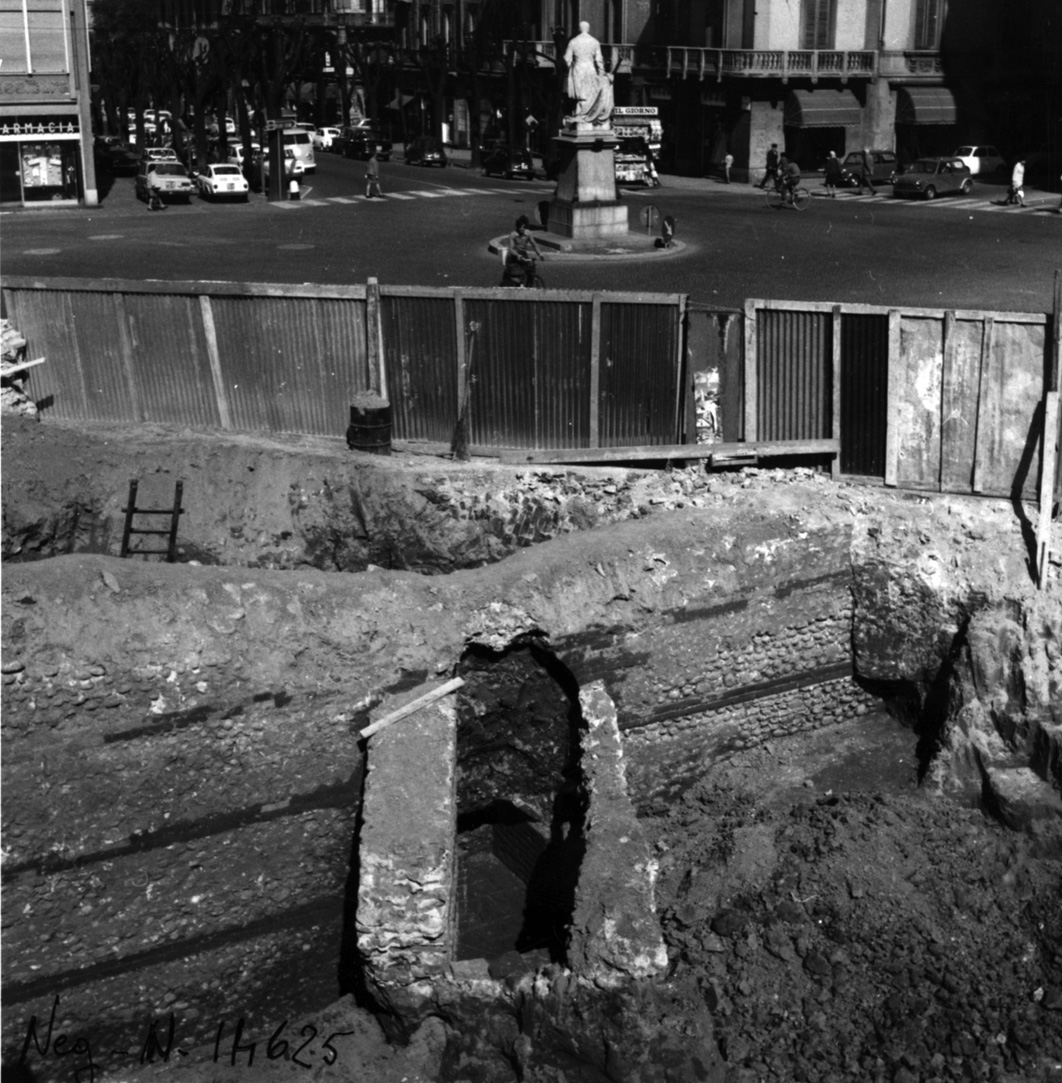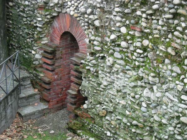 Durante lavori di sbancamento, nel 1970, per la costruzione di un edificio commerciale, sono emersi resti di murature pertinenti alla cinta muraria romana. Si conservano per altezze diverse (da un minimo di 0,10 m. a massimo 3,96 m.) in vari punti della loro lunghezza (in tutto 36,70 m.), in relazione all'andamento irregolare del terreno e al diverso stato di degradazione che ne ha distrutto la sommità. L'andamento è rettilineo, con direzione NW-SE. Tecnica di costruzione: opus mixtum, presente in altre cinte murarie dell'Italia Settentrionale. Materiali impiegati: ciottoli di fiume, laterizi, malta. A circa 3,50 m. dal limite S-E del muro, si apre un passaggio ad arco a sesto rialzato, costruito interamente in laterizi. L'apertura ha dimensioni pari a m. 2,37(h)x0,89(largh)x0,91(profondità). I piedritti sono costituiti da 24 file di laterizi, mentre l'intradosso da tre file parallele di laterizi disposti nel senso della larghezza; la ghiera infine da una corona di laterizi a profilo trapezoidale. Le imposte dell'arco poggiano su una base costituita di laterizi posti di piatto, a scacchiera. Questa pavimentazione continua oltre l'arco verso la parte interna del muro, fino ad una scala di cinque gradini, col piano in laterizi poggianti su una doppia fila di ciottoli legati con malta. Dimensioni della pedata comprese fra 25 e 30 cm. La scala è fiancheggiata da due muri con andamento obliquo. appoggiati a quello di cinta; il muro di S-E è quasi interamente di restauro; l'altro (2,57x2,50x0,70m) presenta tecnica costruttiva simile a quella del muro di cinta, ma con minore regolarità nella disposizione dei filari di ciottoli, a cui si alternano spesso laterizi integri o frammentari. Il varco è da attribuire a fasi insediative successive. La costruzione della cortina si colloca agli inizi del I sec. d.C., in base alla datazione delle anfore utilizzate per diverse opere di drenaggio, rinvenute addossate all'alzato della cinta muraria. Si tratta di diversi tipi di produzione per lo più asiatica (Dressel 6A e 6B). Alcuni bolli datati dalla seconda metà del I a.C. all'età tiberiana costituiscono un terminus post quem per il drenaggio. Non è possibile stabilire i rapporti crono-stratigrafici tra le due opere, tuttavia l'esigenza di regimentare i corsi idrici del terreno fortemente in pendenza induce a ipotizzare che il drenaggio fosse in fase con le mura