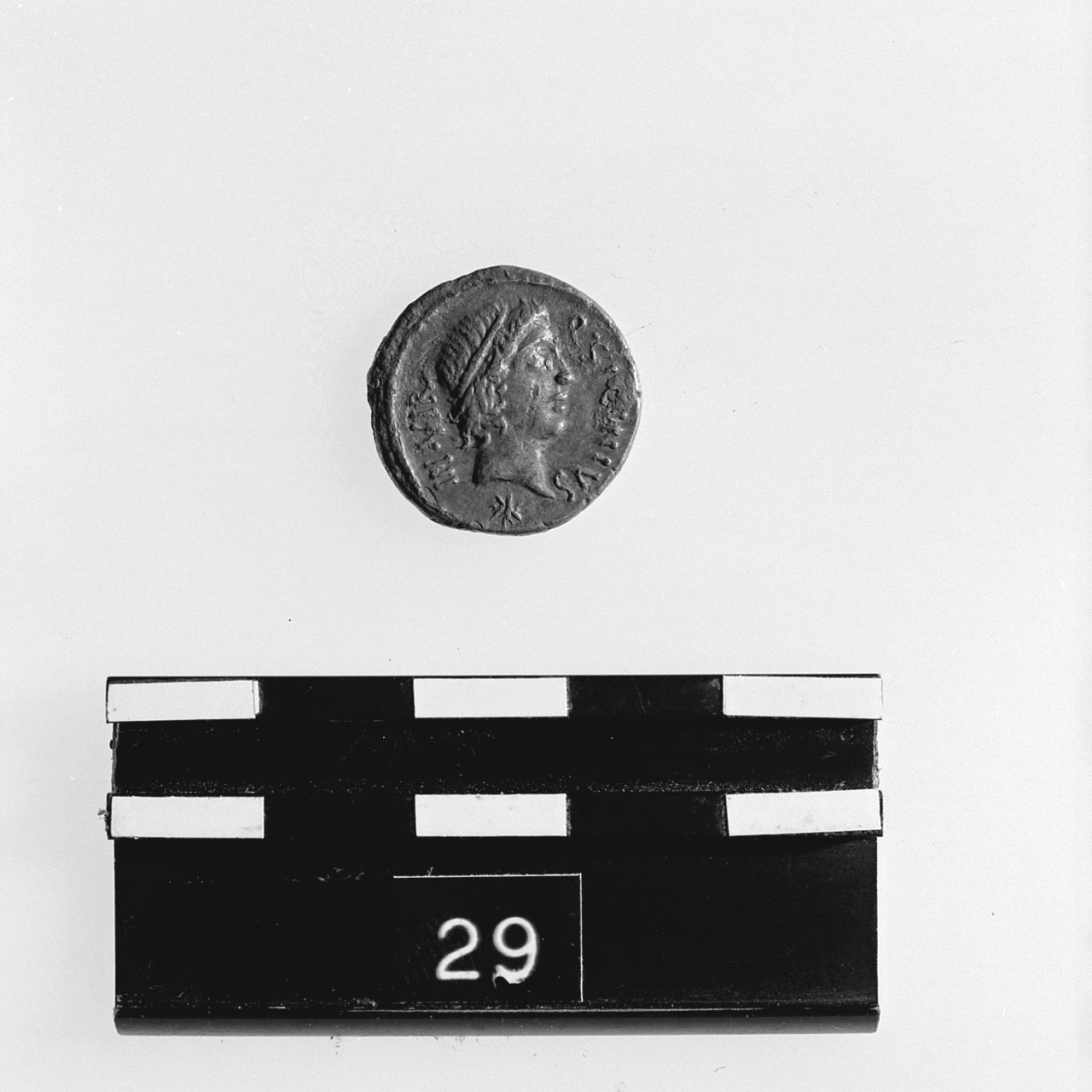 D/Testa di Apollo a d.; sotto, stella; davanti, QúSICINIVS disc.; dietro,||IIIúVIR asc.;c.p. R/Clava con pelle di leone a d.; a s., freccia; a d.,||arco; a d., CúCOPONIVS disc.; a s., PRúSúC asc.; c.p