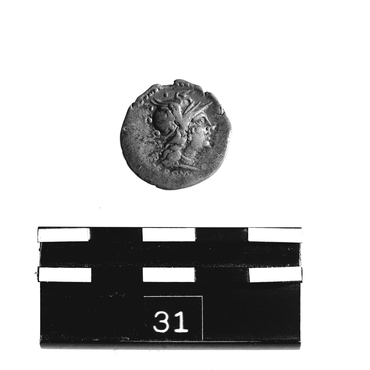D/Testa elmata di Roma a d. con collana di pendenti; dietro, corona e||segno di valore; sotto, ROMA; c.p. R/Dioscuri che cavalcano in||direzioni opposte; in es.,CúSERVEILIúM[úF]