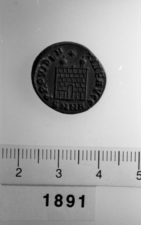 D/ CONSTAN-TINVS AVG Testa laureata di Costantino,||a d. Bordo di punti.||R/ PROVIDEN-TIAE AVGG Porta di accampamento con||due torri, sormontata da stella. In esergo: SMNA.||Bordo di punti