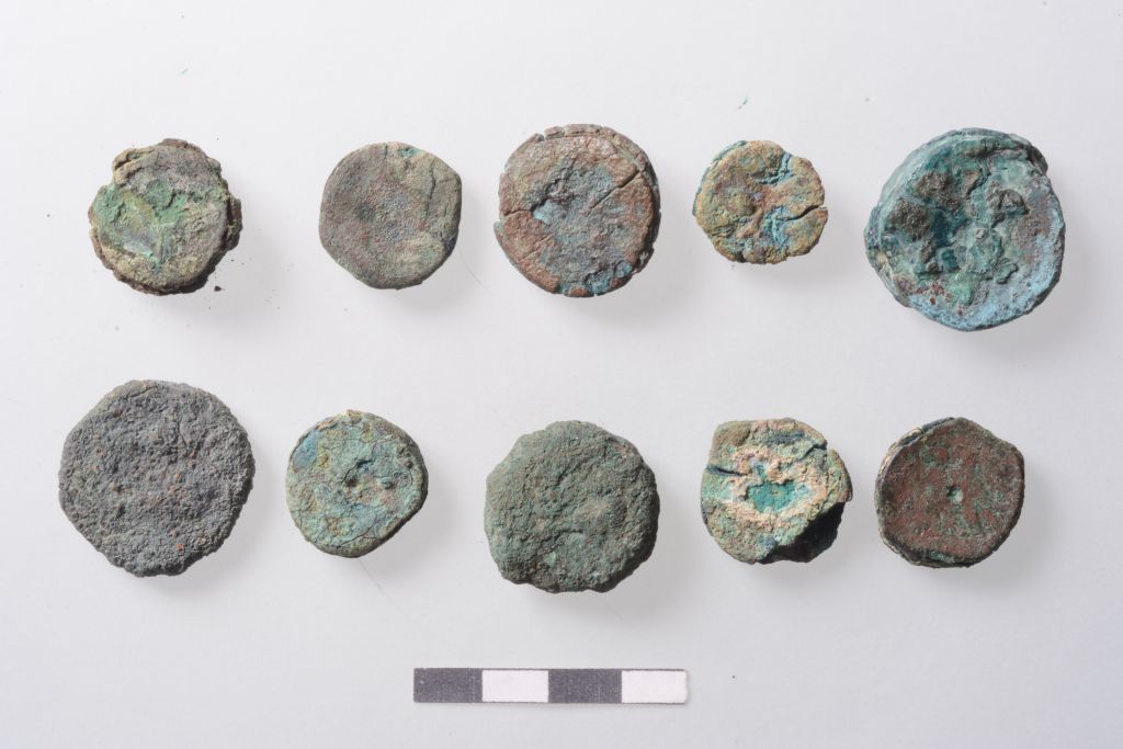 10 Monete, di modulo medio, molto usurate e illeggibili o scarsamente leggibili. Un esemplare mostra con maggiore chiarezza al D/ Testa di Zeus a destra e al R/ Due aquile a sinistra su un fulmine. Sono presenti scarse tracce di legenda [PTOLEMAIOU BASILEOS]