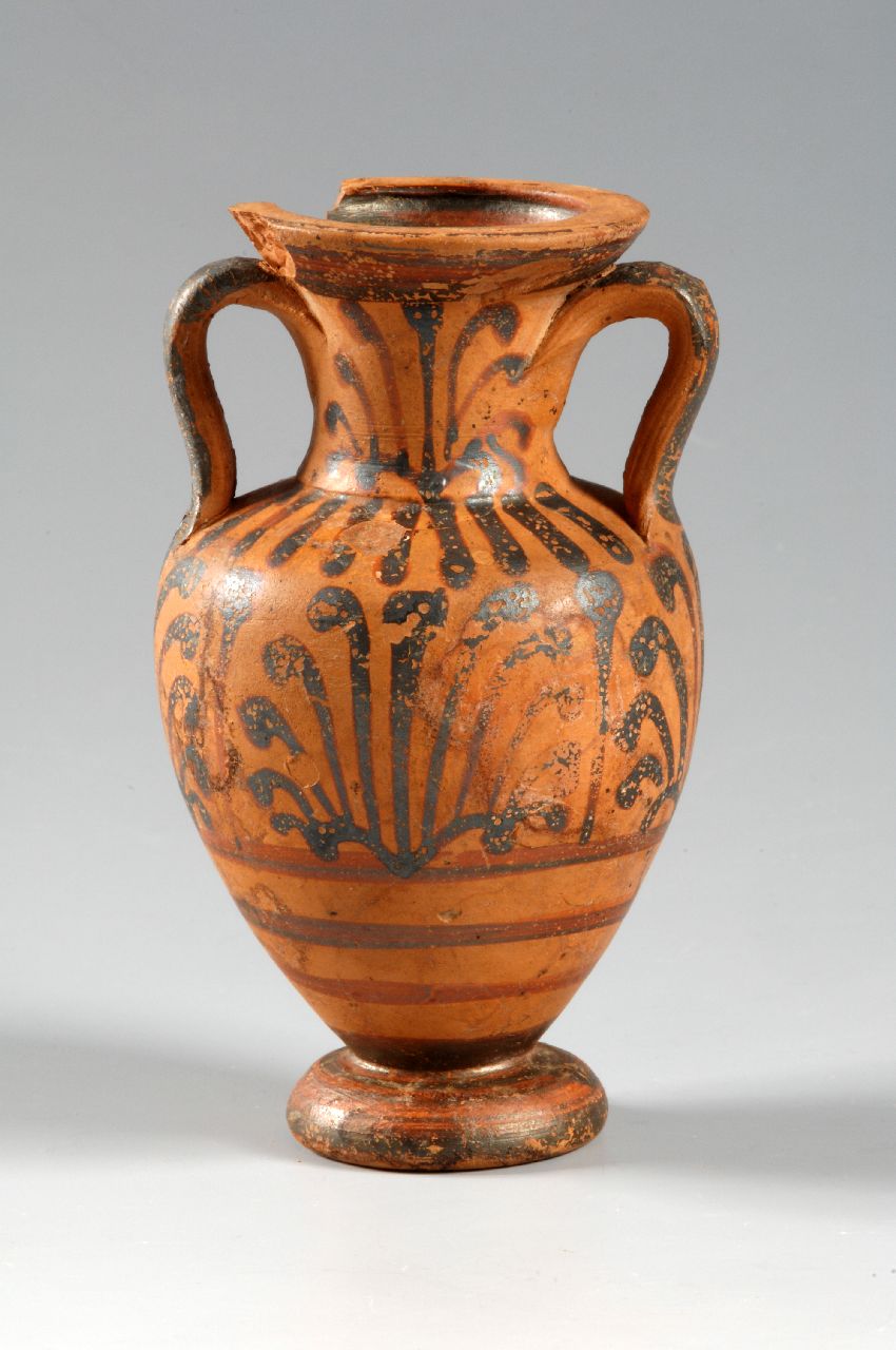 Orlo ad echino superiormente appiattito, collo cilindrico rastremato al centro, corpo ovoide con spalla carenata fortemente rastremato verso il basso, piede a disco con profilo convesso; anse verticali a nastro impostate sulla spalla e sotto l'orlo. Decorazione dipinta: sul collo due palmette verticali fra le anse; sulla spalla bastoncelli disposti a raggi; sulla parte alta del corpo sequenza di grosse palmette separate da motivo lineare inspessito verso l'alto; sulla parte bassa del corpo tre linee orizzontali rosso-bruno; anse, esterno dell'orlo, interno del collo e piede interamenteverniciati in nero