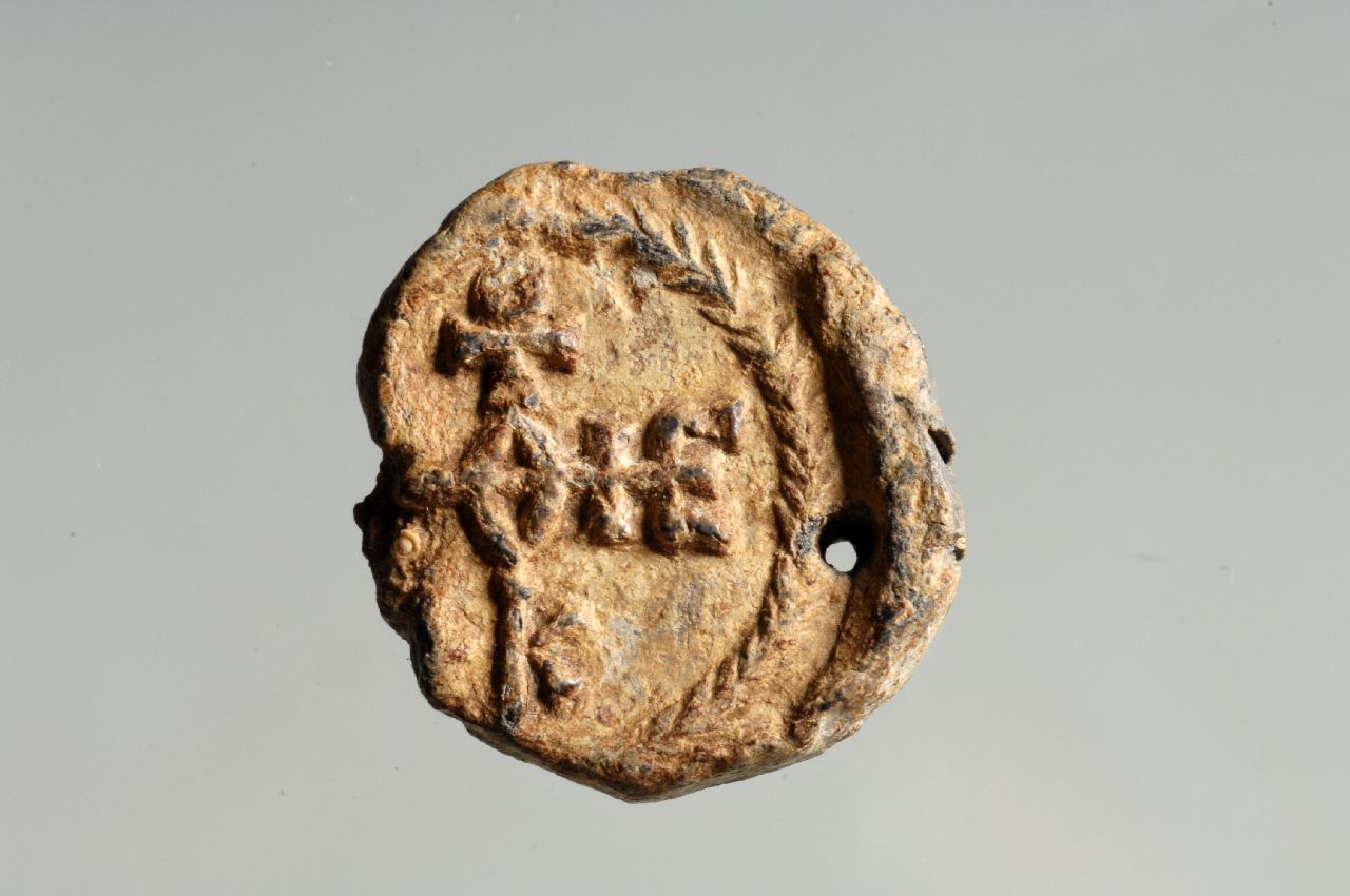 Sigillatura di forma irregolarmente circolare, a facce piatte, con canale longitudinale per il legamento e forellino secondario da riutilizzo, per probabile sospensione del sigillo in funzione di amuleto, lungo il margine.D/ Monogramma cruciforme invocativo: theotoke boethei. A sinistra manca lalettera B, a destra IE, in alto TO, in basso K. Sul bordo ghirlanda che corre verso l'alto. R/ Monogramma cruciforme con A a sinistra, NE in legatura a destra, OMEGA in basso, TOU in alto. Sul bordo una ghirlanda che corre verso l'alto. Si tratta probabilmente di un nome proprio non riconducibilea nessun personaggio individuabile