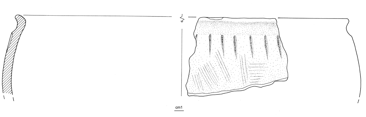 orlo estroflesso sottolineato da risega, parete convessa, serie di tacche verticali sotto l'orlo, tracce di steccatura a pettine sul corpo