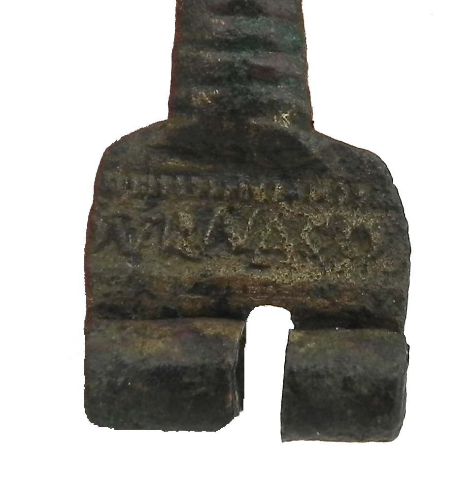 Arco stretto, con sezione verticale a 'D' decorato da incisioni orizzontali; testa larga con marchio DURNACO tra due file di decorazioni a puntini; staffa corta, piena, triangolare, chiusa all'apice da un bottoncino