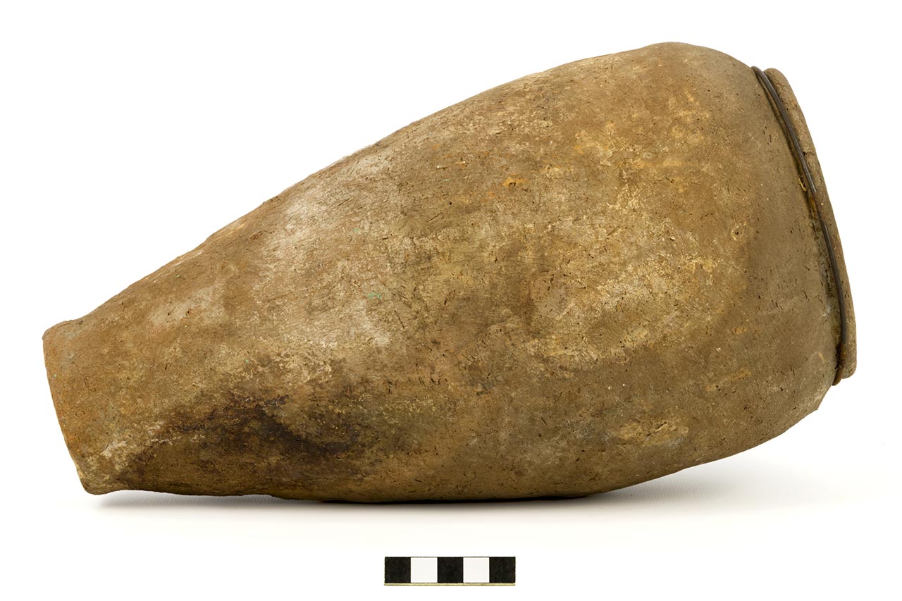 Giara da birra, presenta corpo allungato, fondo piatto, orlo semplice. La superficie esterna presenta tracce di un ingobbiatura di colore bianco e abbondanti tracce di inclusi vegetali