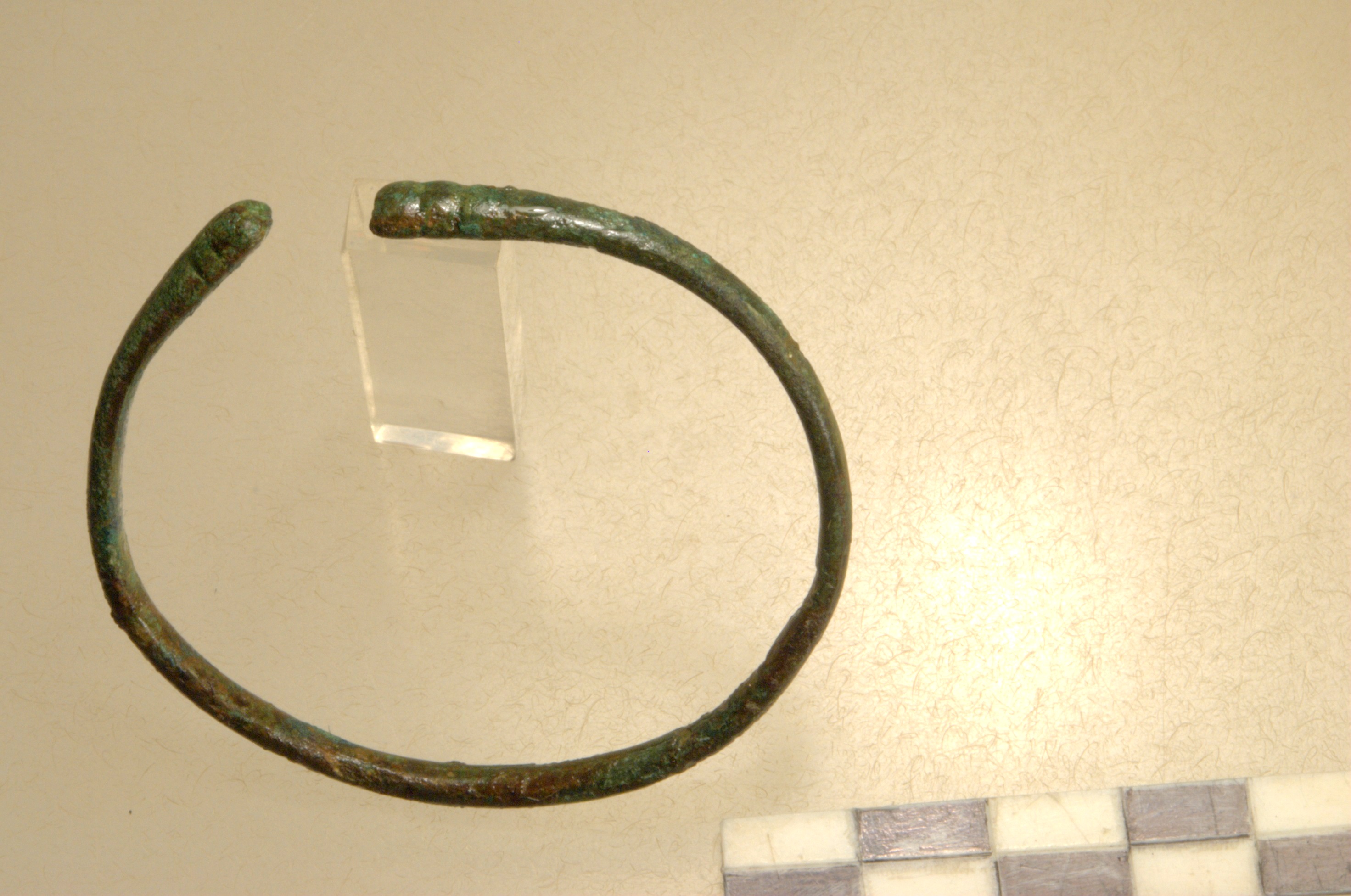 Esemplare di armilla in bronzo con verga a sezione circolare con capi aperti ed estremità appena ingrossate e sagomate