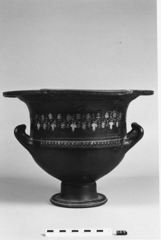 Argilla nocciola; vernice nera opaca. Labbro revoluto, orlo svasato, separato dal corpo con una risega; corpo campaniforme con risega sopra l'attaccatura delle anse; piede campanulato con scanalatura presso il taglio, che è lievemente inclinato verso l'interno; anse a bastoncello ispessite verso l'attaccatura, ricurve verso l'alto, impostate sulla parte inferiore del corpo