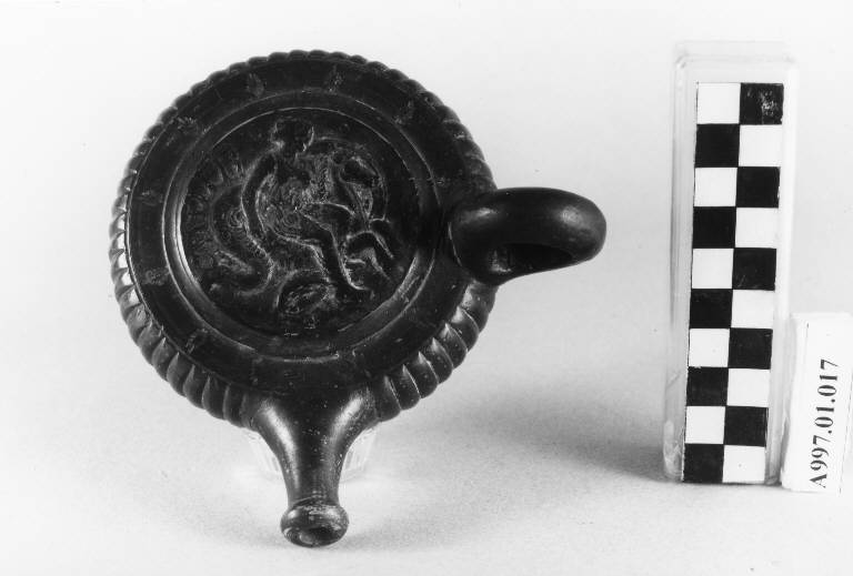 Argilla rossastra; vernice nera lucente. Beccuccio tubolare leggermente obliquo, desinente in un orlo ingrossato; nella parte superiore del corpo medaglione a rilievo iscritto in un incavo; corpo globulare schiacciato; piede ad anello sagomato, con scanalatura nel punto di massima espansione; fondo cavo verticale con foro di immissione; ansa a nastro impostata ad anello sulla spalla, a 90 gradi rispetto al beccuccio
