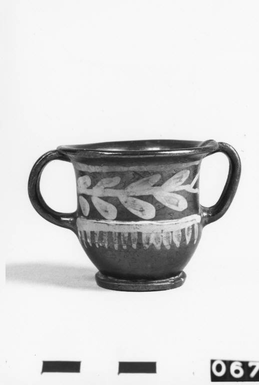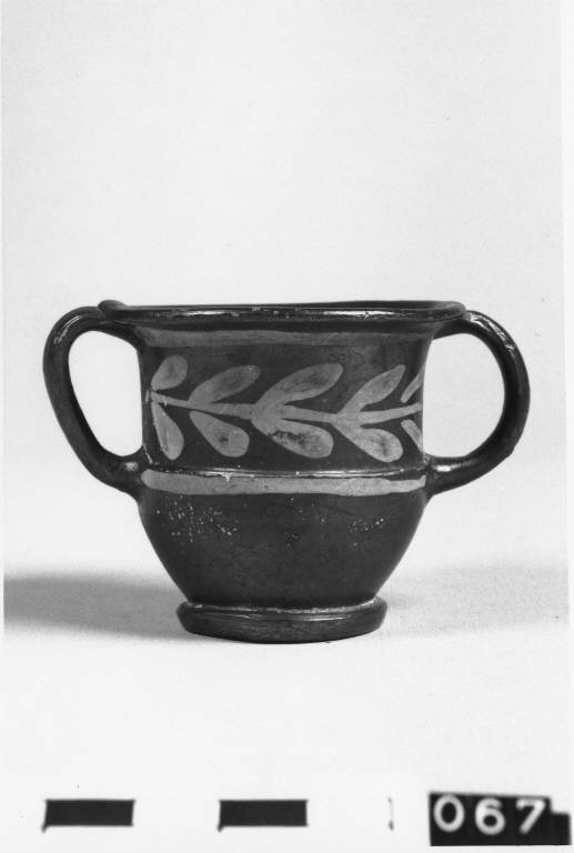 Orlo arrotondato, labbro estroflesso, corpo cilindrico rastremato verso il basso, piede a disco cilindrico, anse a sezione circolare