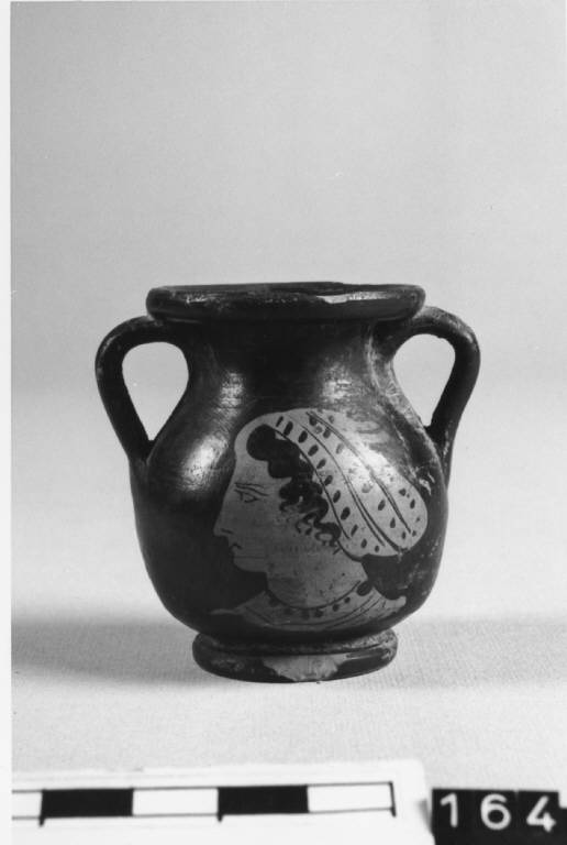 Orlo arrotondato, labbro estroflesso,collo cilindrico, corpo globoso, piede a disco, anse a nastro verticali