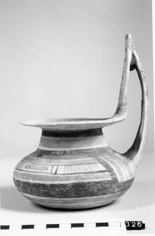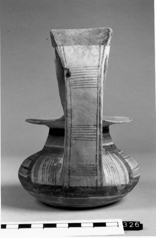 Ampio labbro orizzontale, collo troncoconico, corpo globoso molto compresso, alta ansa verticale a nastro impostata sul labbro e sul corpo, fondo piatto