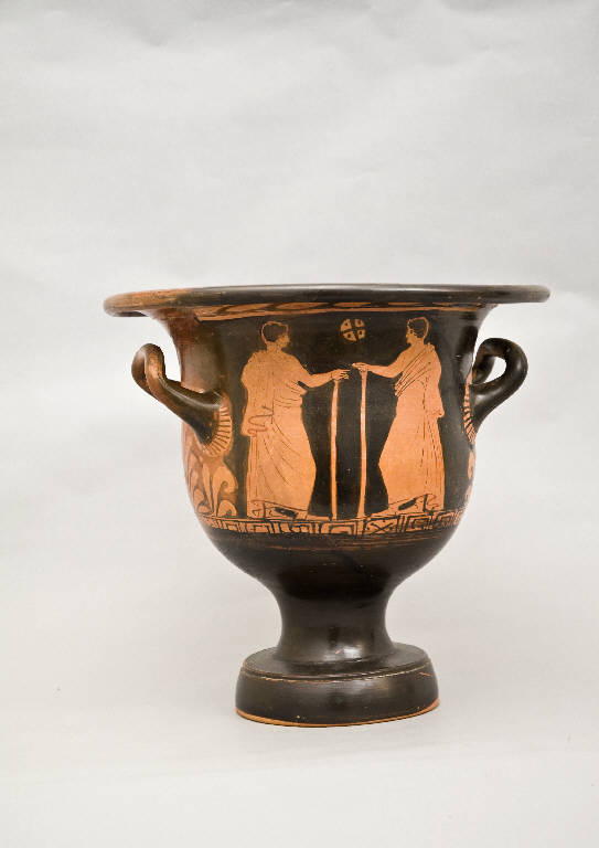 Corpo ceramico nocciola, vernice nera lucente, arrossata in più punti, ingobbio marrone. Sovraddipinture in bianco. A rispermio all'interno del vaso una parte.||Orlo ingrossato, labbro estroflesso, corpo campaniforme, piede campanulato, fondo cavo. Anse a bastoncello impostate sul corpo orizzontalmente