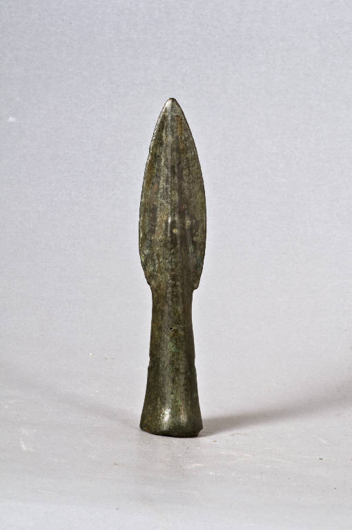 Cuspide a forma di foglia d'alloro, con costolatura mediana semicircolare; immanicatura conica a cannone, nella parte mediana fori per fissaggio