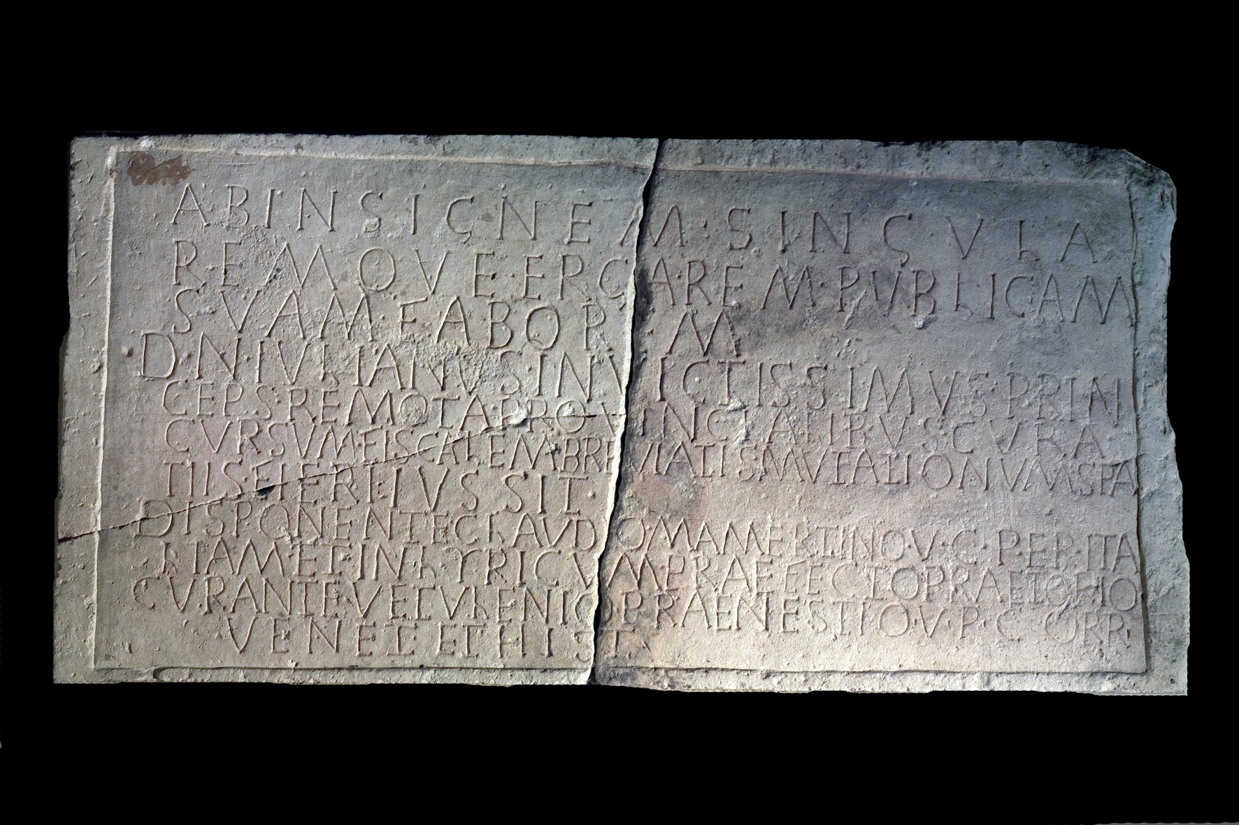 - ISCRIZIONI specchio epigrafico - [-]B INSIGNEM.SINGVLA/REM.ERGA.REM.PVBLICAM/SVAM.FABOREM/D.M.IVLIANVS.INVISTISSIMVS.PRIN/CEPS.REMOTA.PROVINCIALIBVS.CVRA/CVRSVM.FISCALEM.BREVIATIS.MVTATIONVM.SPA/TIIS.FIERI.IVSSIT/DISPONENTE.CLAVDIO.MAMERTINO/V.C.PER.ITA/LIAM.ET.ILYRICVM.PRAEFECTO.PRAETORIO/CVRANTE.VETULENIO.PRAENESTIO/V.P.CORR/VENET.ET.HIS - capitale - a incisione - latino