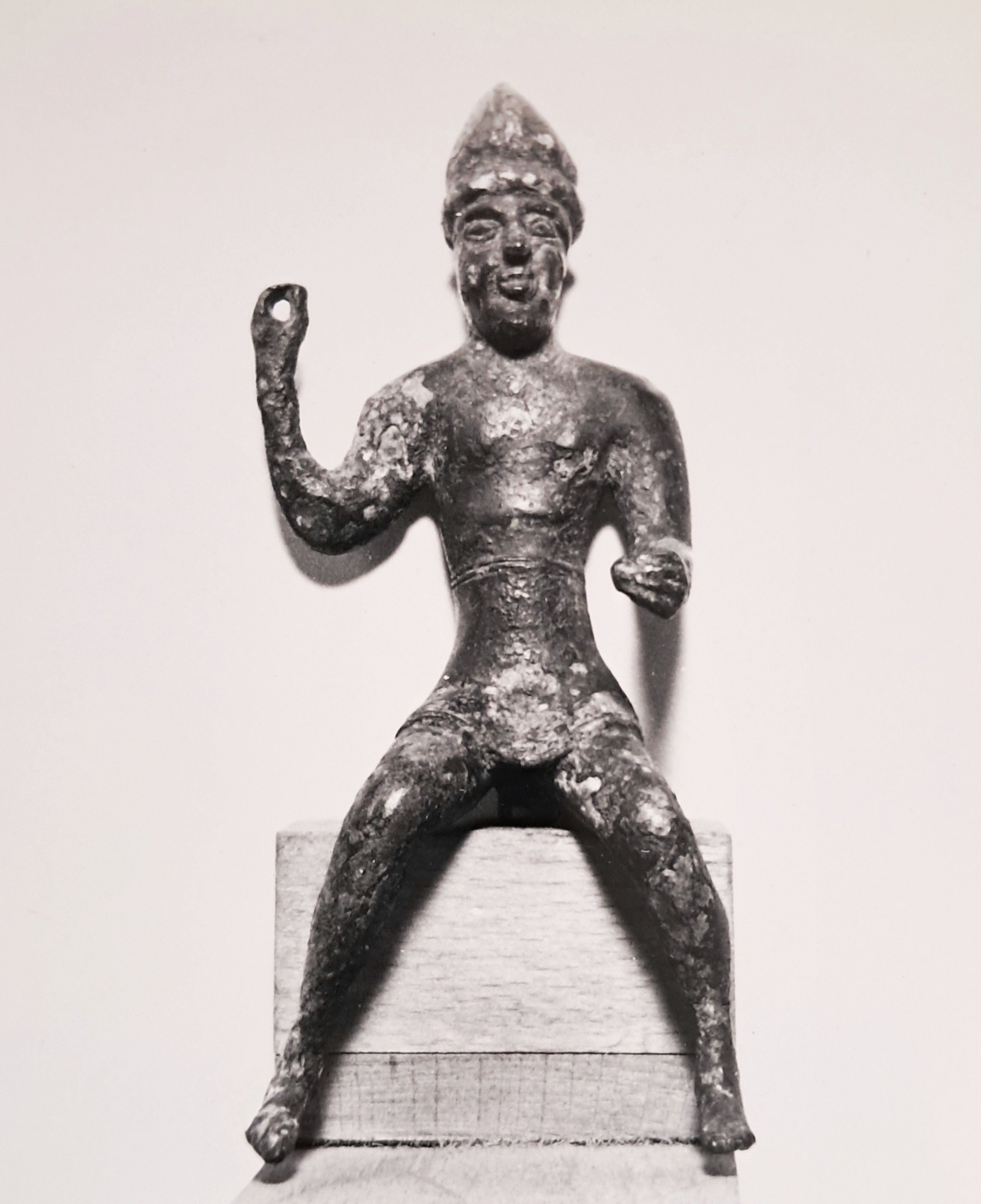 Figura seduta, che indossa un corto gonnellino a campana; sul capo porta un elmo tipo Negau, a calotta; mano destra sollevata in atto di tendere la lancia (mancante); mano sinistra in atto di stringere la spada o lo scudo (mancanti)