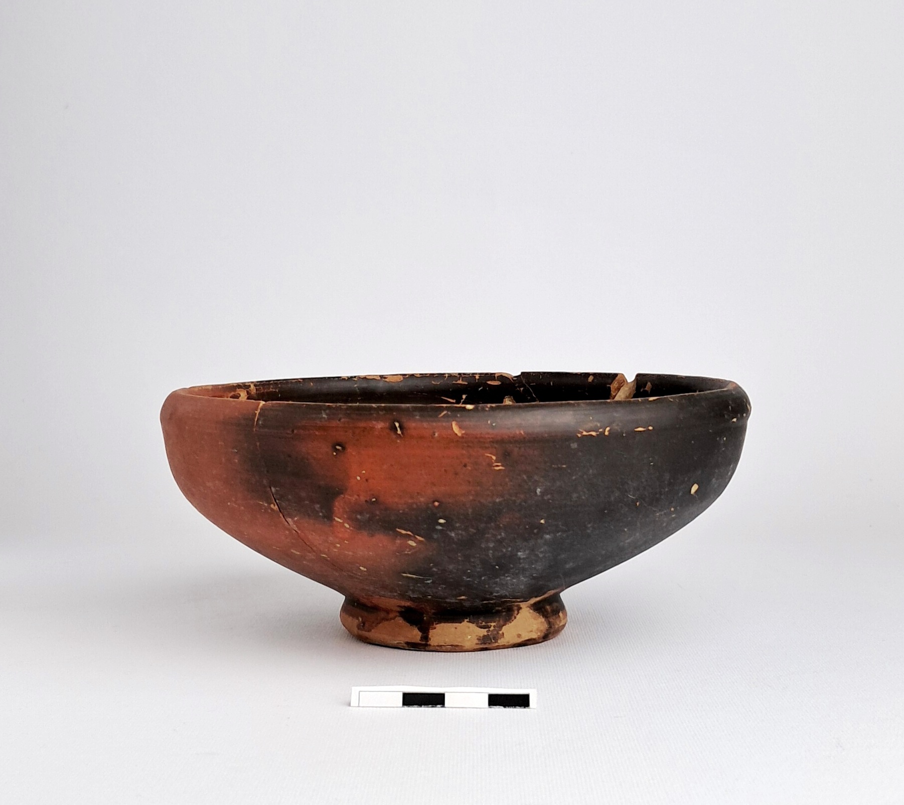 Orlo esternamente ingrossato; vasca con lieve carena arrotondata nella parte superiore troncoconica; piede ad anello obliquo. Decorazione interna: dal centro, coppia di cerchietti incisi irregolarmente; quattro rosette; coppia di cerchi incisi distanziati