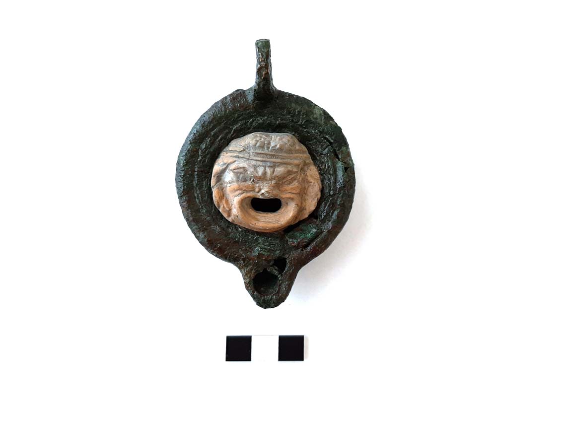 Lucerna a becco curvilineo leggermente allungato con presa verticale forata. Il disco presenta due cerchi concentrici e al centro è stata inserita, probabilmente in età moderna nell'intento di realizzare un pastiche, un volto grottesco, originariamente non pertinente, la cui bocca simula il foro per l'alimentazione. Il piede è ad anello. La superficie è intaccata da ossidazione e ricoperta da una patina
