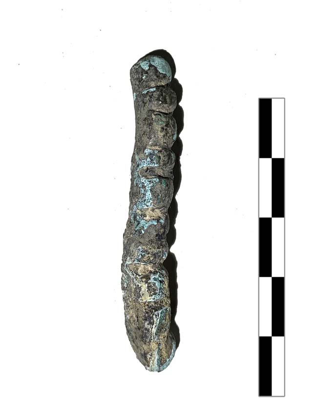 Probabile frammento di bracciale (tipo armilla), con verga a sezione circolare, ricomponibile da due frammenti. Decorato sulla porzione visibile con profonde costolature trasversali a distanze regolari