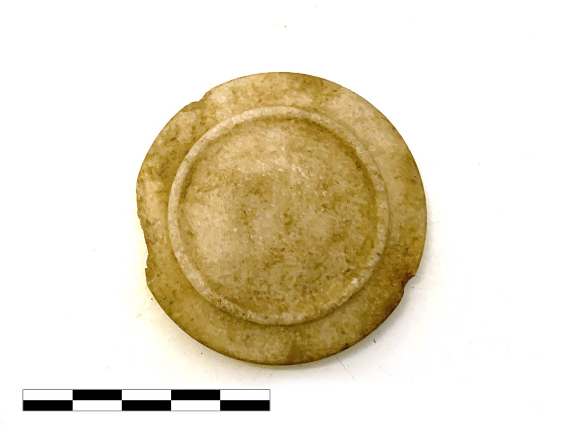 Pisside cilindrica in alabastro di produzione greca o magnogreca, completa di coperchio (I3). Etichetta bordata di blu con n. 2 all'interno