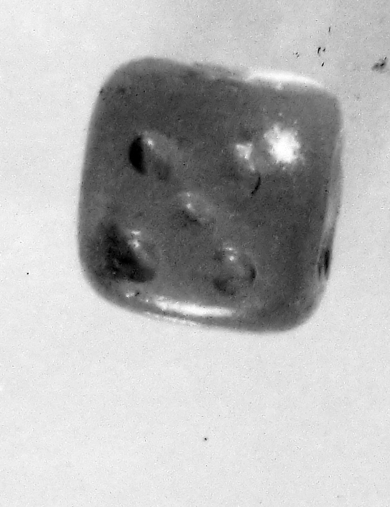 Il piccolo dado cubico, tagliato in ambra, ha i numeri indicati da un punto inciso