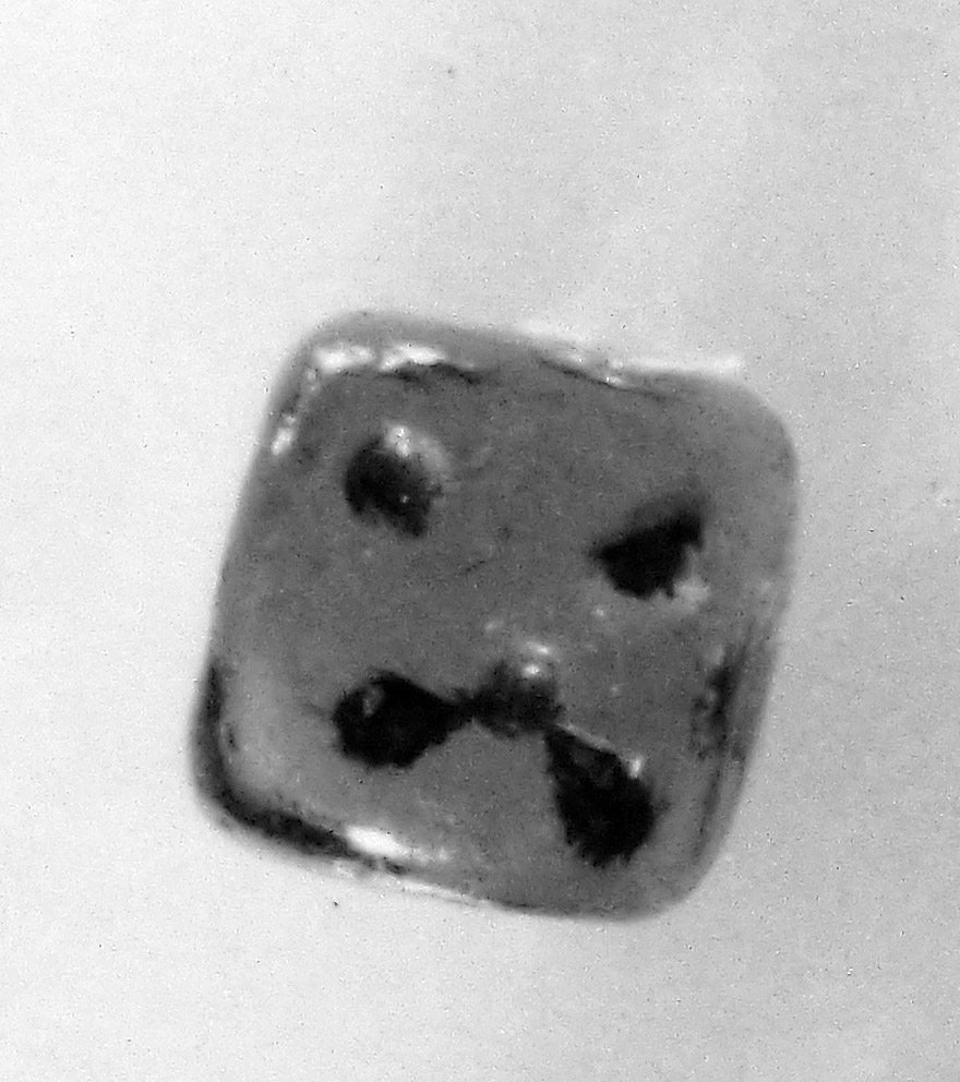 Il piccolo ddao cubico, tagliato in ambra, ha i numeri indicati da punti incisi. Ambra gialla traslucida