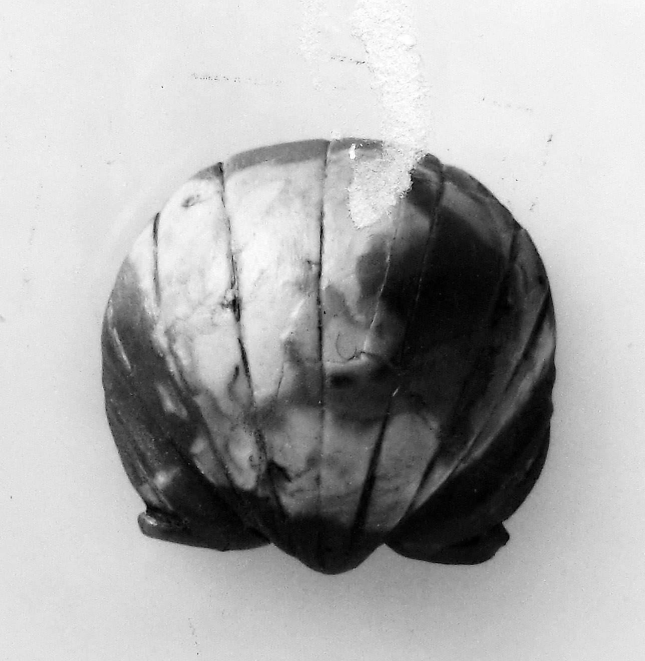 Valva di conchiglia, che riproduce naturalisticamente quella del cardium, con la superficie esterna scanalata e quella interna liscia. Ambra giallo scuro, non trasparente