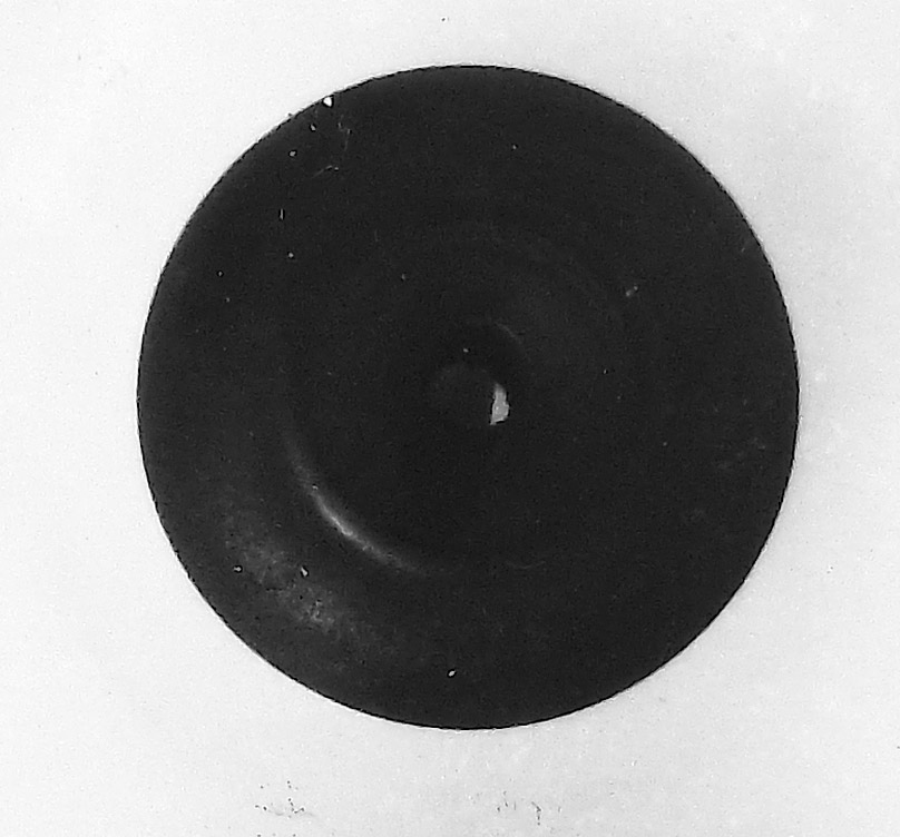 Il frammento, di forma conica, fa verosimilmente parte di uno "scettro". Attorno al foro centrale vi sono alcuni cerchi concentrici incisi. Ambra rossastra opaca
