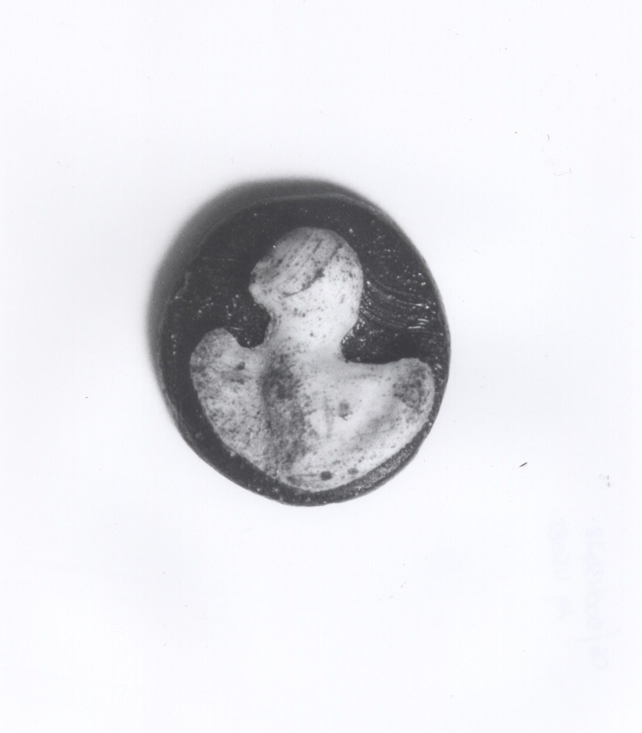 cammeo circolare di colore bruno e bianco/ busto di Psyche volto a destra