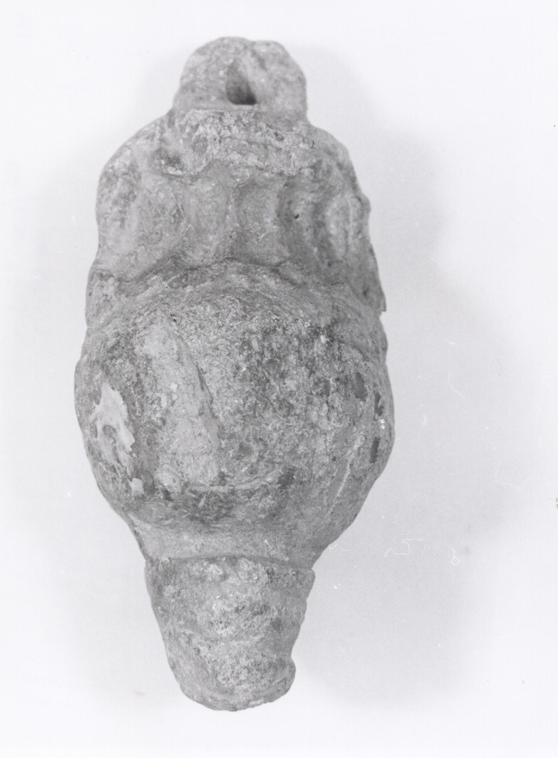 peso a forma di anforetta, presa a sezione circolare con foro circolare per la sospensione, anse a "s" chiuse, collo decorato a centinature, corpo globulare, puntale allungato desinente a bottone, orlo piatto
