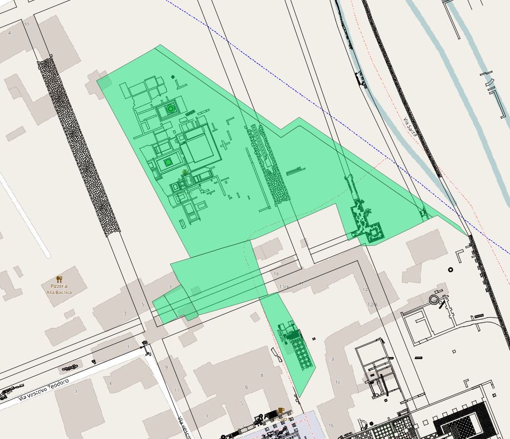 l'area comprende i resti di un isolato abitativo ed è attualmente aperta al puvbblico con accesso da piazza Capitolo, dalla pista ciclabile e dal collegamento pedonale posteriore alla Basilica
