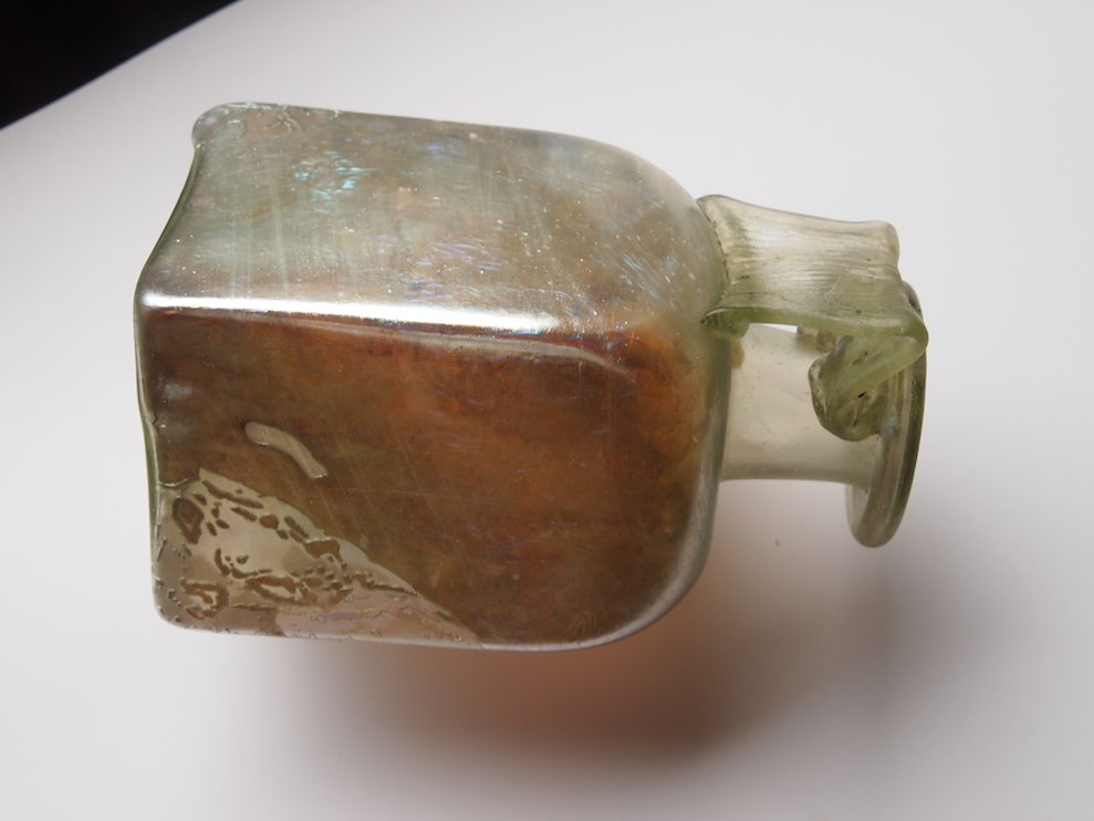 Bottiglia con orlo ribattuto, breve collo cilindrico, ansa a nastro con cotonature a pettine piegata ad angolo tra collo e spalla, ventre parallelepipedo, fondo di forma quadrangolare, piano e internamente ispessito. Vetro verde chiaro traslucido