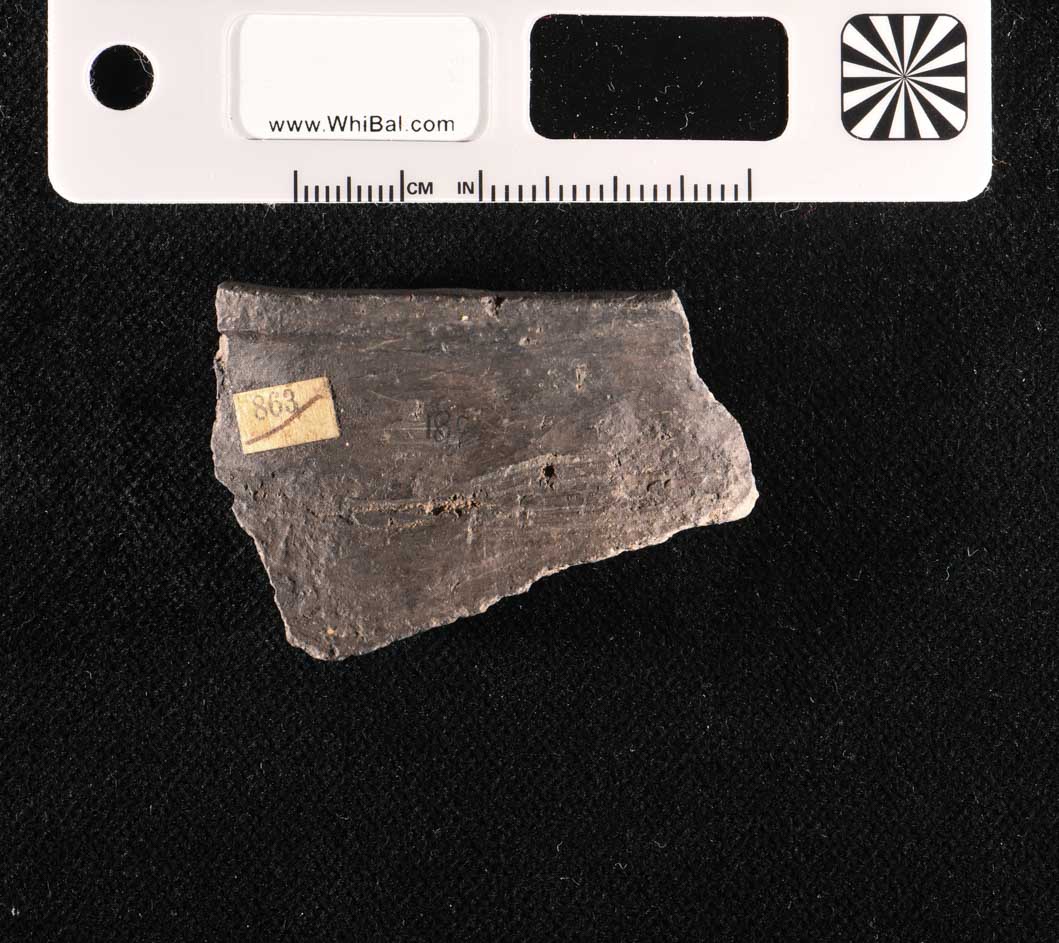 Frammento di orcio con orlo arrotondato e assottigliato; il labbro è più chiuso rispetto alla spalla, su cui si distinguono ancora le tracce di spatola. Impasto grezzo, di colore nero