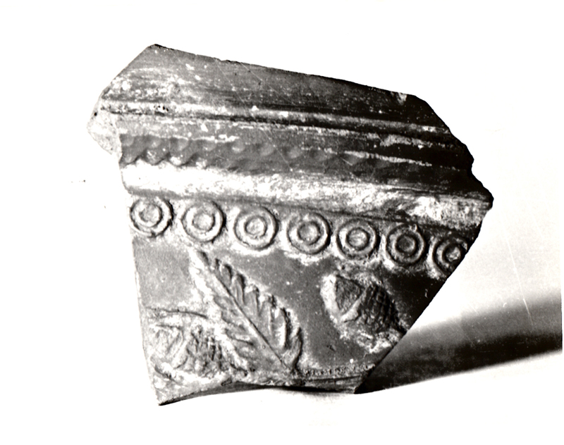 fr. di coppetta di tipo non determinabile. Resta parte dell'attacco dell'orlo. Sotto un giro di rosette formate da due cerchi concentrici, corre una ghirlanda di quercia