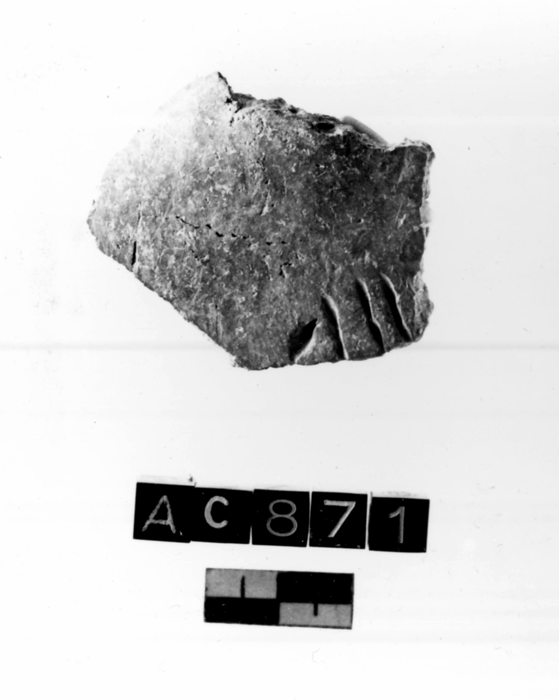 Frammento di parete di vaso in prossimità del fondo, con decorazione a impressioni singole ripetute, a forma di piccole "gocce", molto strette e allungate. Impasto non depurato Superficie lisciata. Colore nerastro