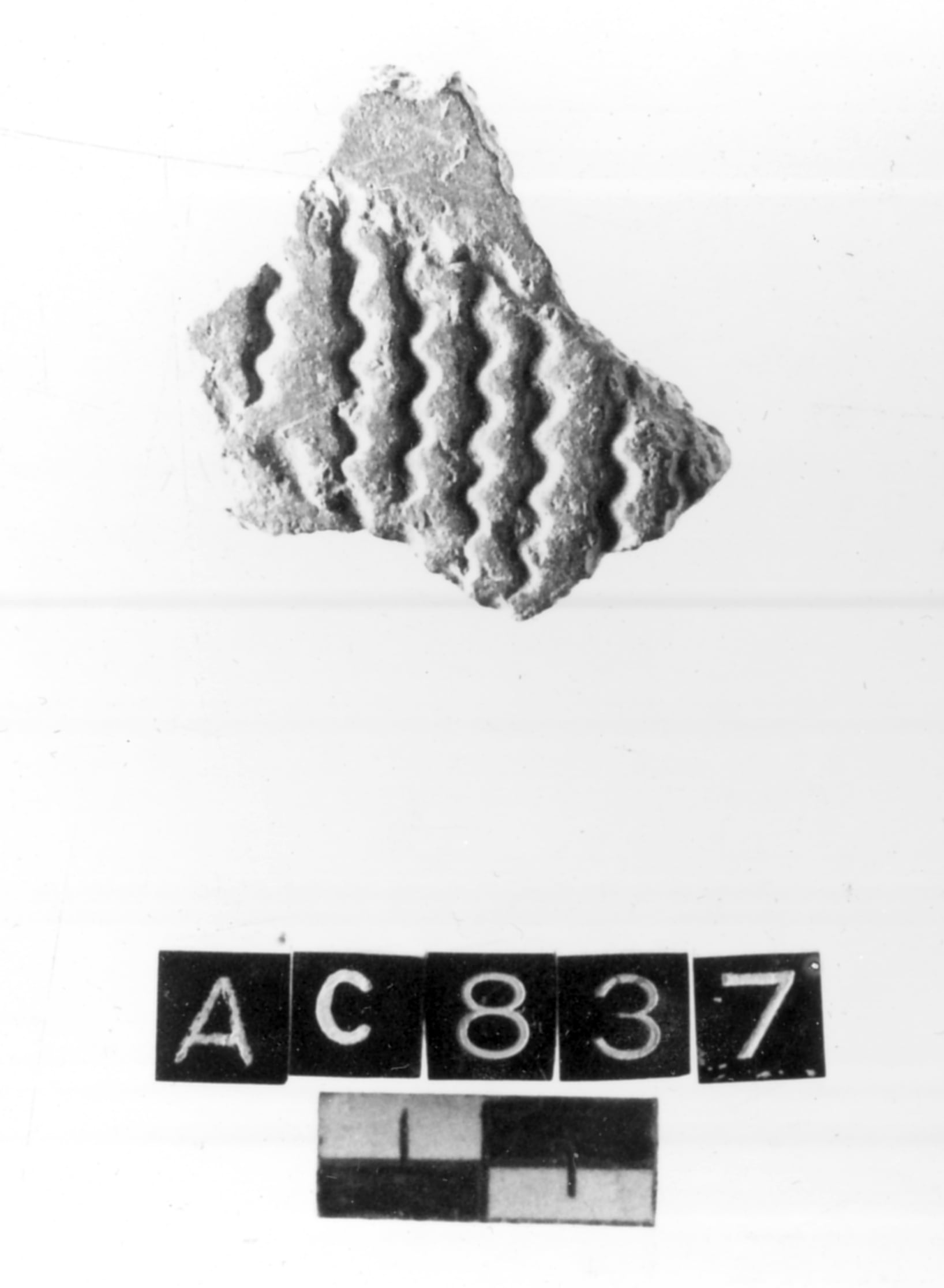 Frammento di parete di vaso, la cui forma non è riconoscibile, decorato ad impressioni con una banda orizzontale internamente tratteggiata da segmenti cardiali disposti obliquamente. Impasto non depurato. Superficie levigata. Colore bruno