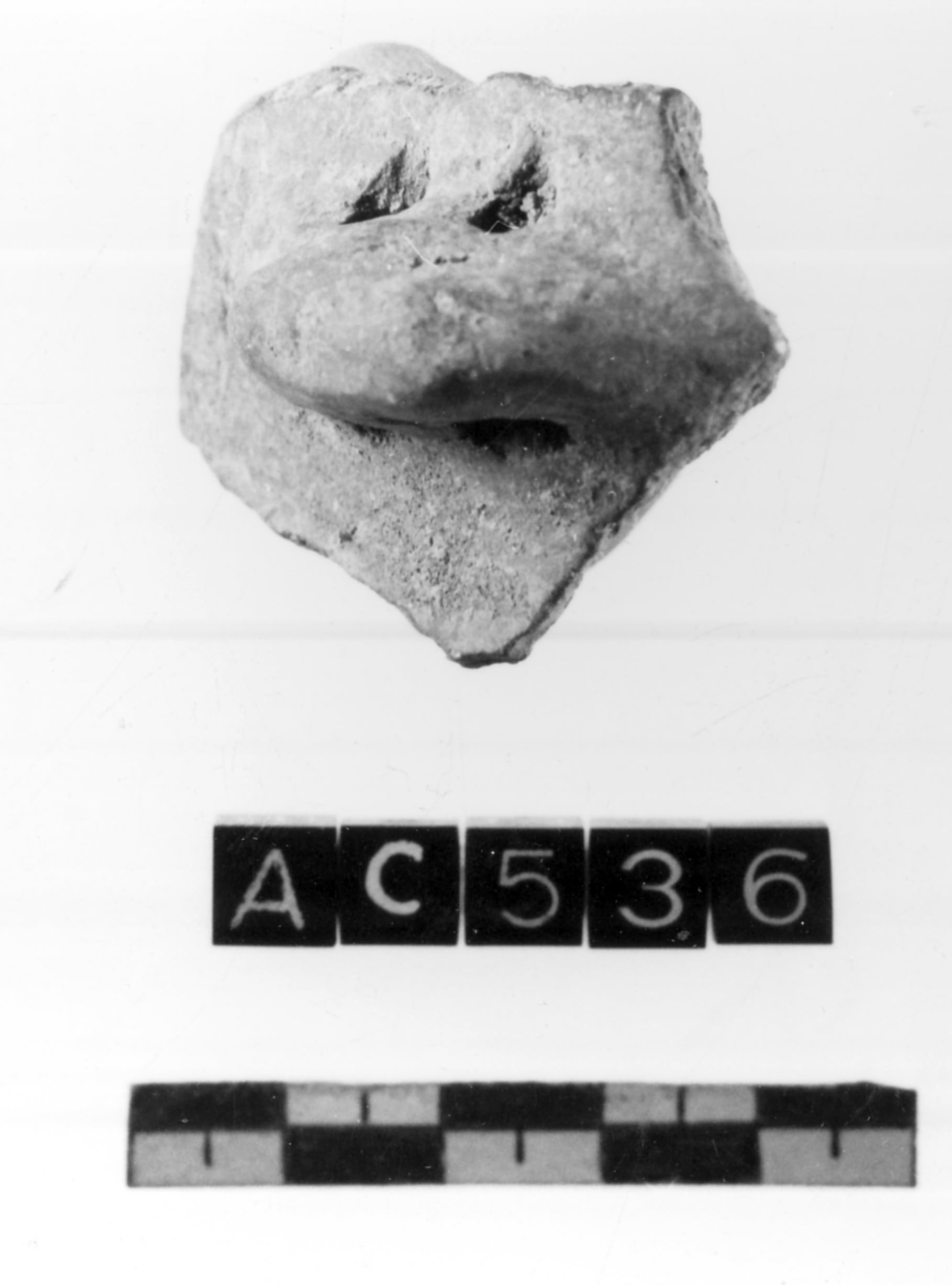 Frammento di vaso, la cui forma non è riconoscibile, conservante una presa a linguetta con due fori verticali. Impasto poco depurato. Superfici lisciate. Colore grigio
