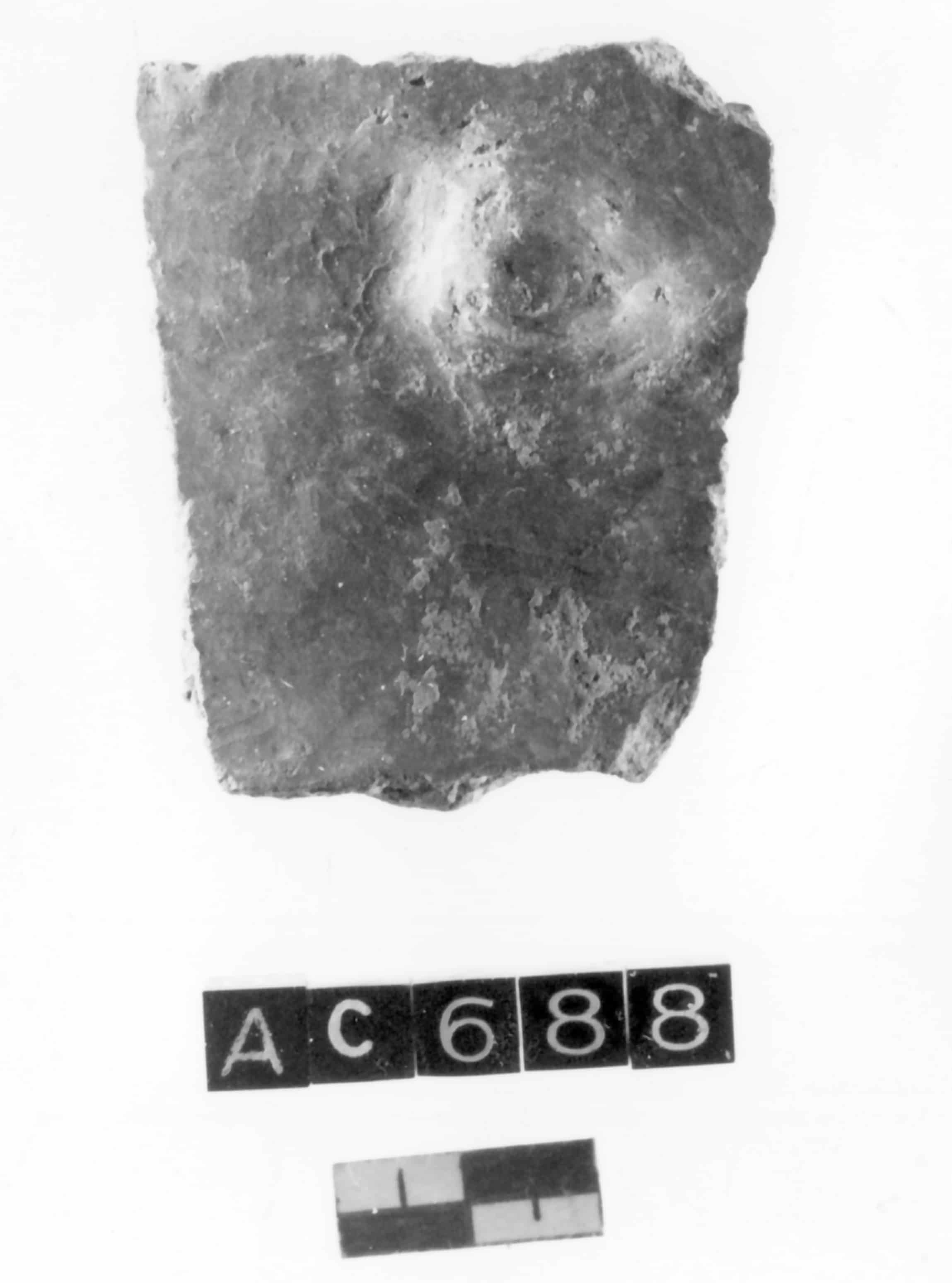 Frammento di parete di vaso, la cui forma non è riconoscibile, che conserva una bugnetta conica ad apice appiattito. Impasto non depurato. Superficie lisciata, opaca. Colore rossiccio