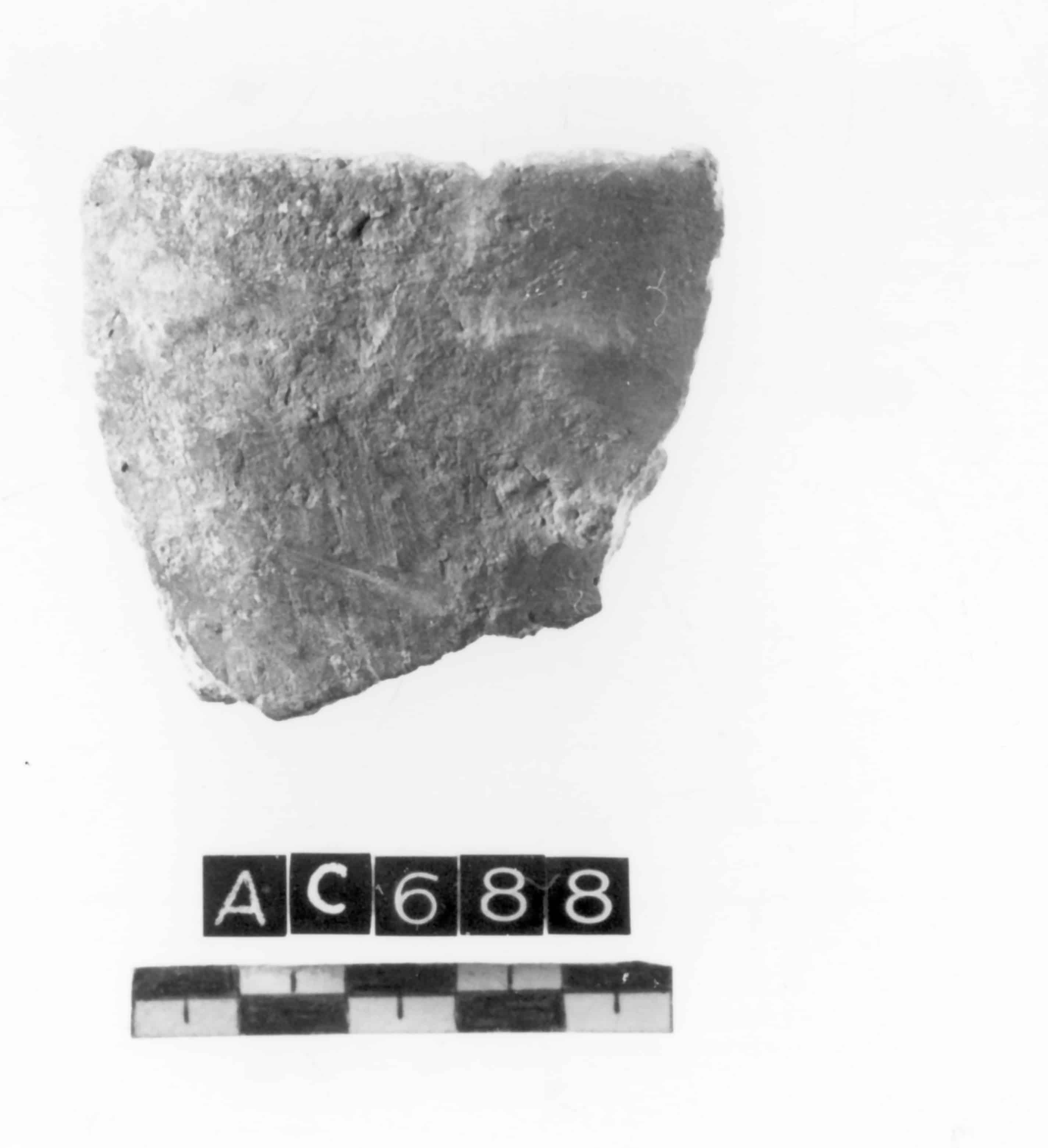 Frammento di tazza con orlo arrotondato, decorato con tacche. Conserva la traccia dell'attaccatura dell'ansa. Impasto poco depurato. Superfici lisciate. Colore grigio scuro