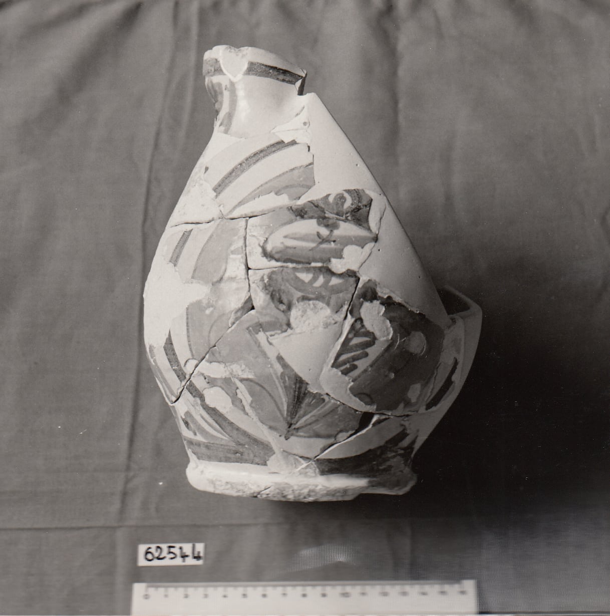 boccale a bocca trilobata, corpo ovoidale con massima espansione al centro, piede a disco piatto, rilevato all'esterno, impasto giallastro, tenero,depurato, marnoso. decorazione dipinta: nella parte frontale motivo floreale stilizzato entro ovale in giallo; ai lati decorazioni fitomorfe in blue campiture in arancione; sotto l'ansa tracce di marca, costituita da duelettere dipinte, probabilmente una L mutila e una i