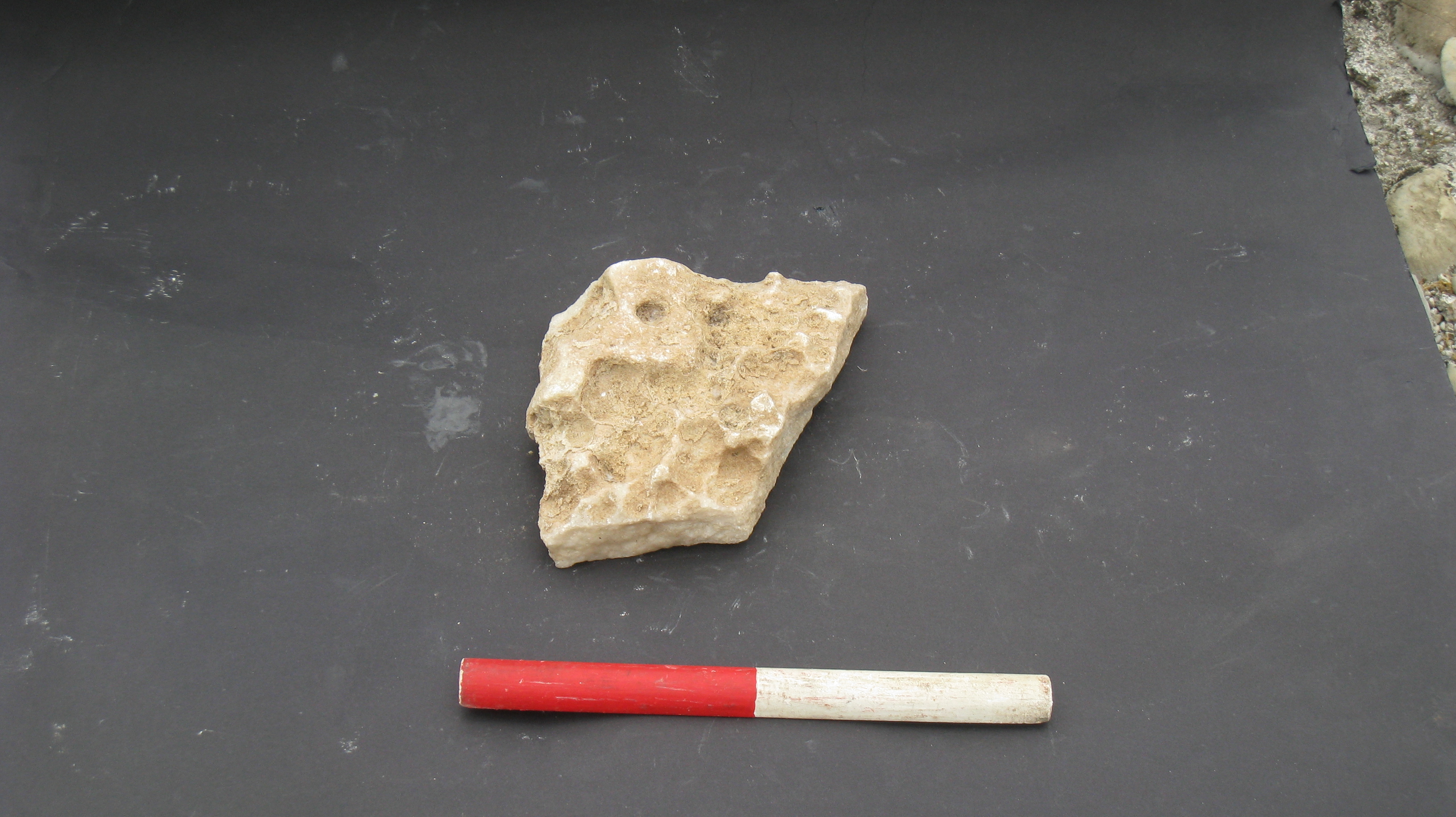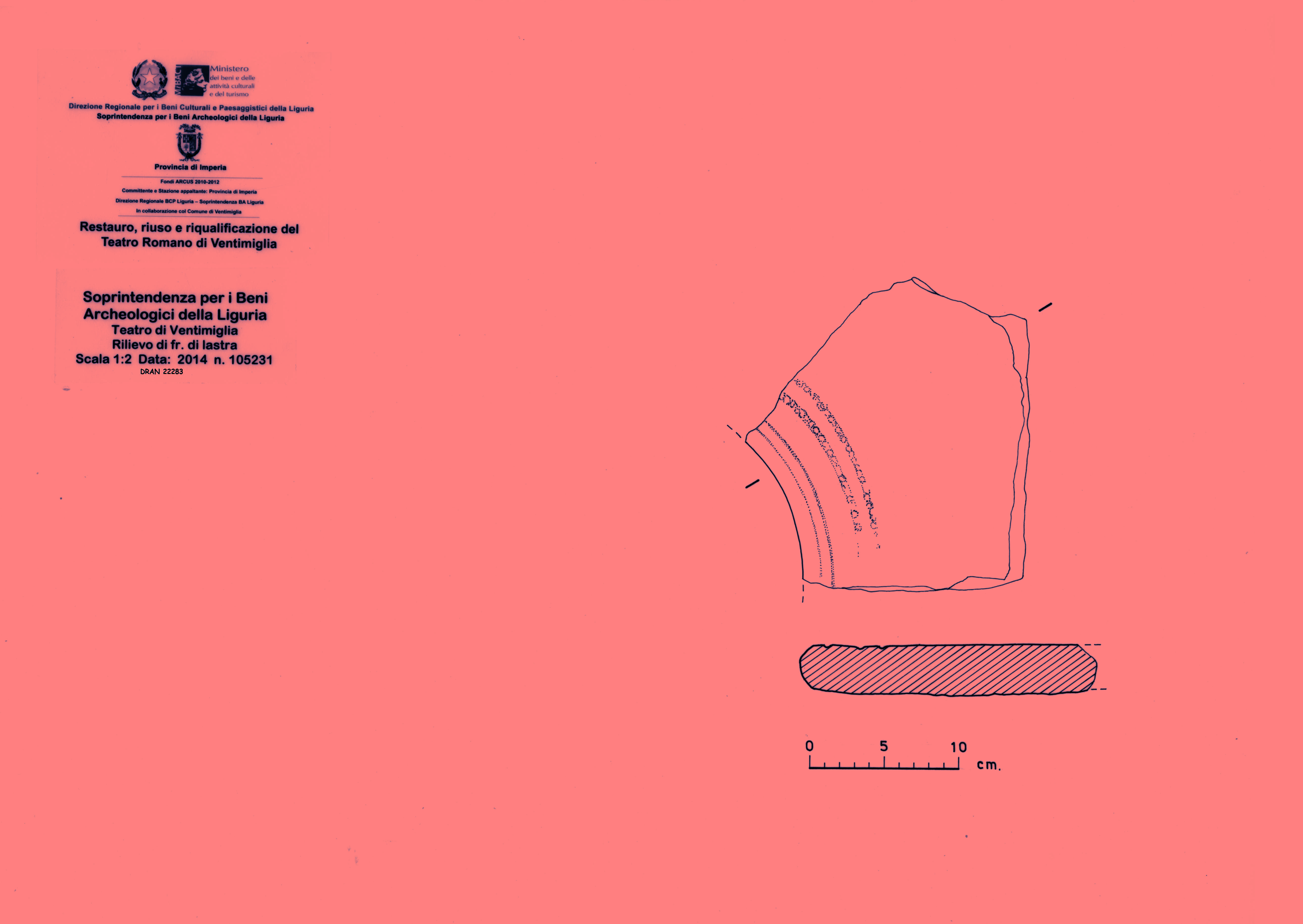 frammento di lastra in opus sectile. Una superficie è lisciata e presenta una cavità circolare di ca cm 10,5 di diametro; il retro è molto irregolare e presenta protuberanze