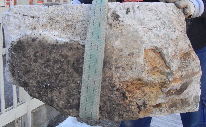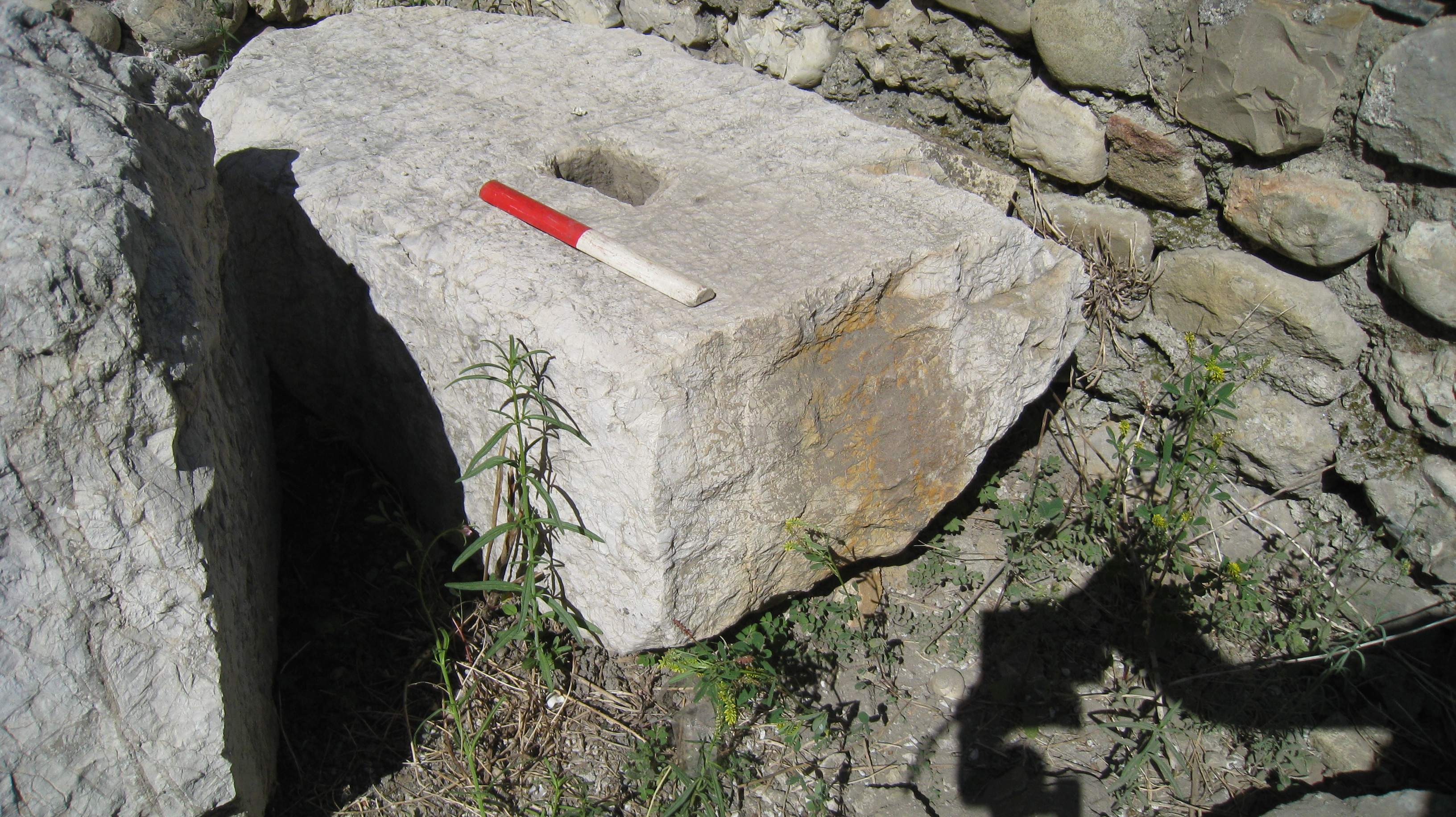 blocco parallelepipedo caratterizzato da due lati paralleli lavorati e lisci. Sul piano d'attesa si osserva un foro per olivella (6x8x5) e una fascia di anatirosi