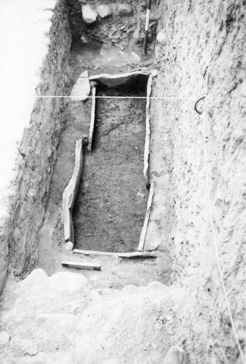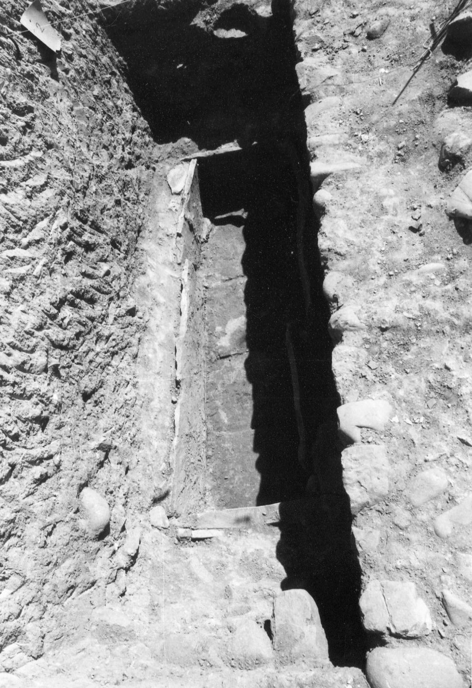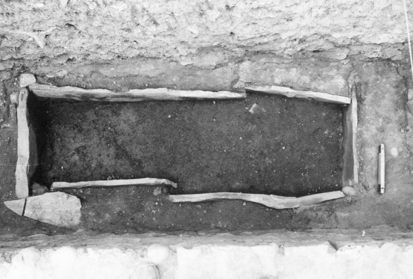 La cassa è ottenuta con tre lastre orizzontali poste a formare il fondo, lastroni di pietra verticali per formare le pareti e sopra lastre orizzontali per formare la copertura. Un lato lungo della sepoltura si addossa al muro della basilica, quindi è posteriore alla costruzione dell’edificio di culto. Al suo interno era presente un solo individuo in pessime condizioni di conservazione