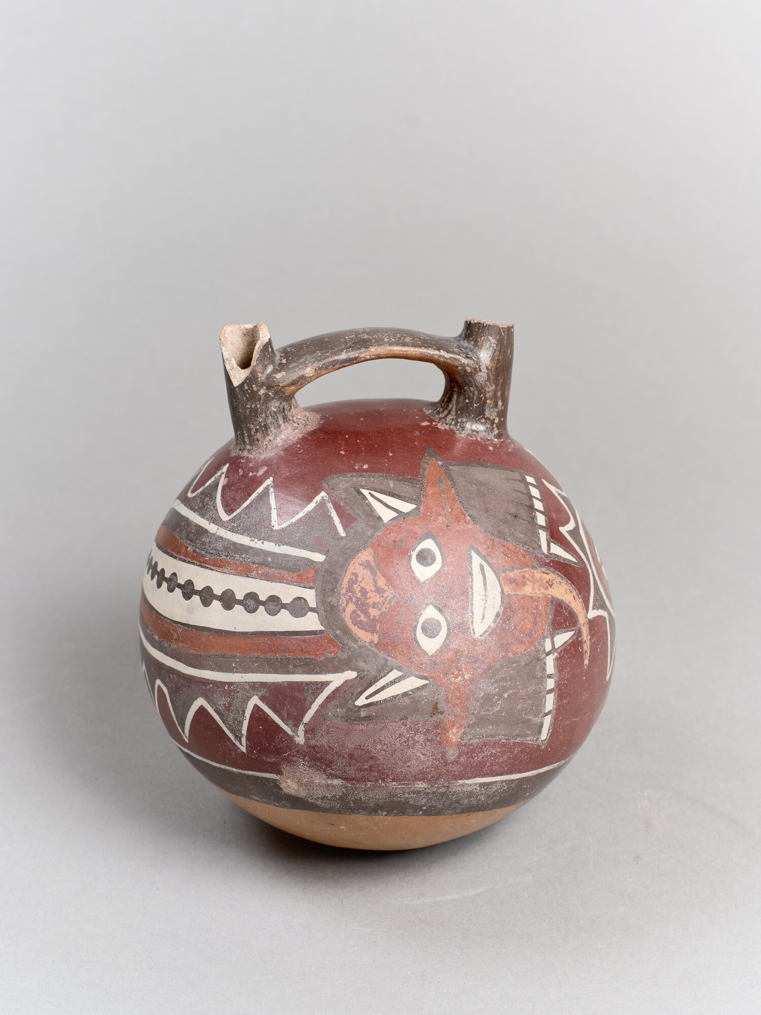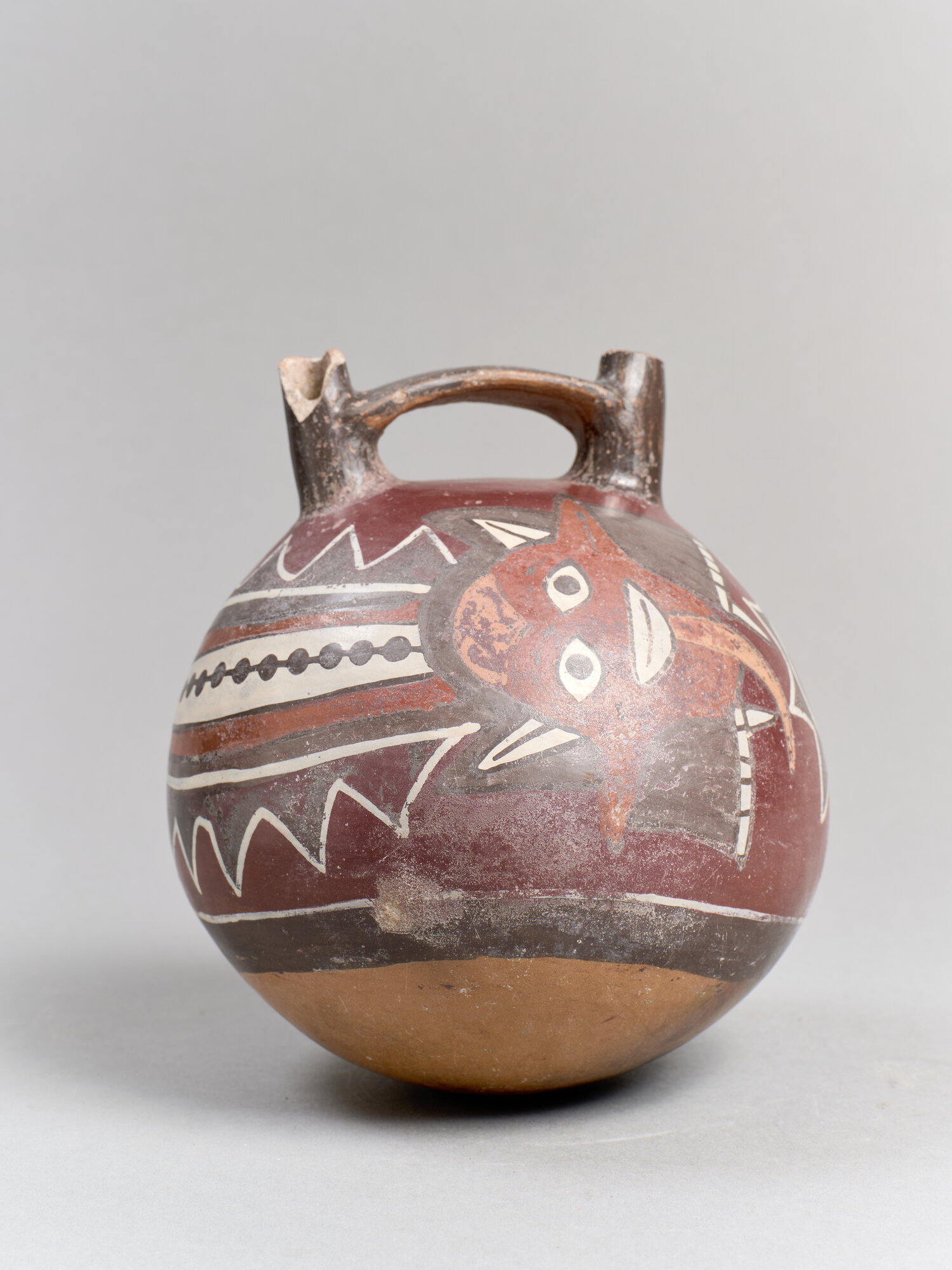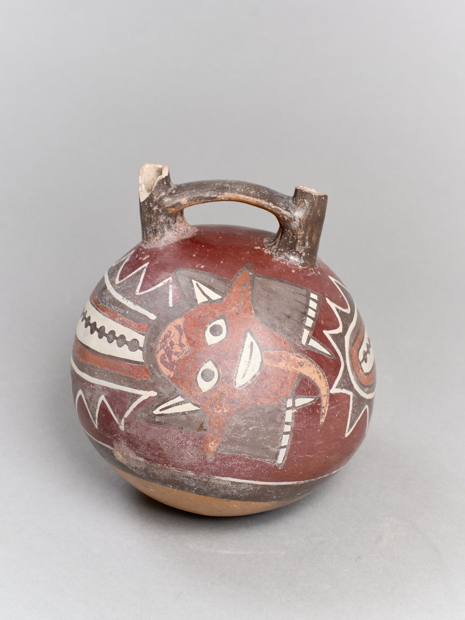 Vaso apode che presenta tracce di cattiva cottura. Il fondo convesso è dipinto in ocra. La parete è decorata con due figure zoomorfe dai colori arancio, ocra, marrone e crema, bordate di nero su fondo prugna. L'ansa e i due becchi divergenti sono dipinti in marrone