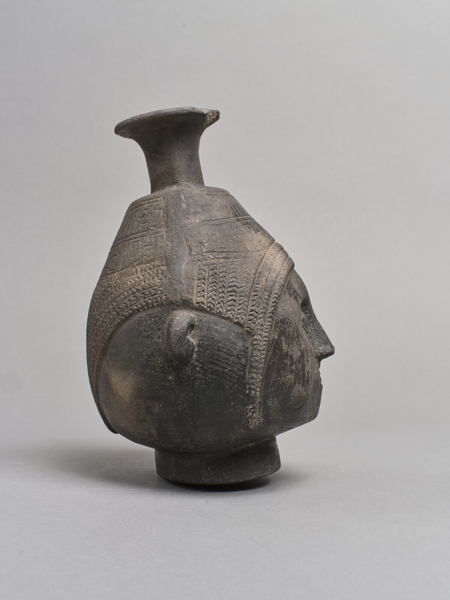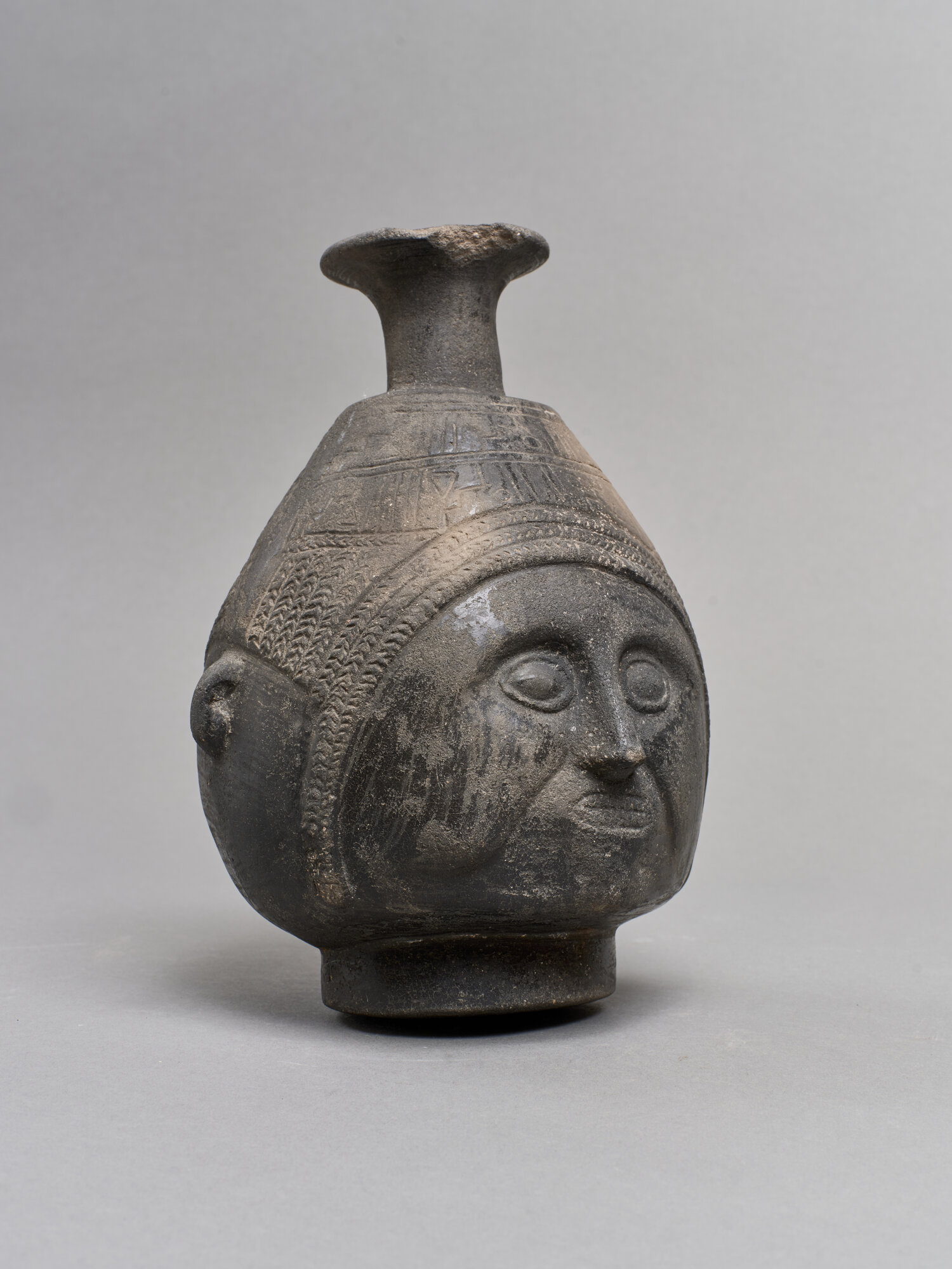 Anfora cefalomorfa in terracotta di colore nero, con piede distinto e fondo piatto. Il collo cilindrico del recipiente ha orlo estroflesso. La camera ariballoide è a forma di testa antropomorfa, raffigurante un volto con naso, occhi e orecchie a rilievo; queste ultime costituiscono una sorta di manici. La bocca dentata è incisa, così come la capigliatura a treccine e il copricapo, decorato da motivi geometrici incisi