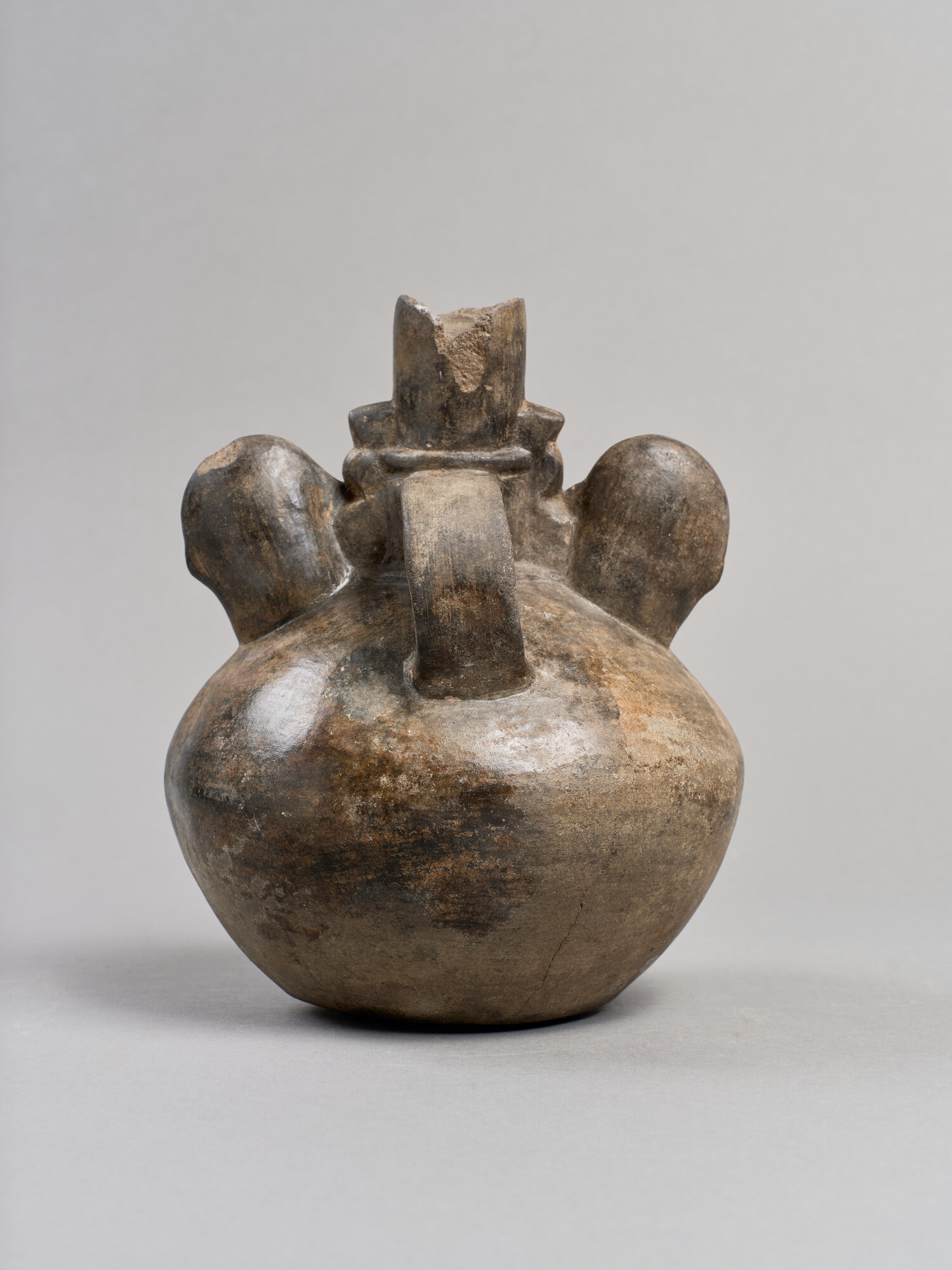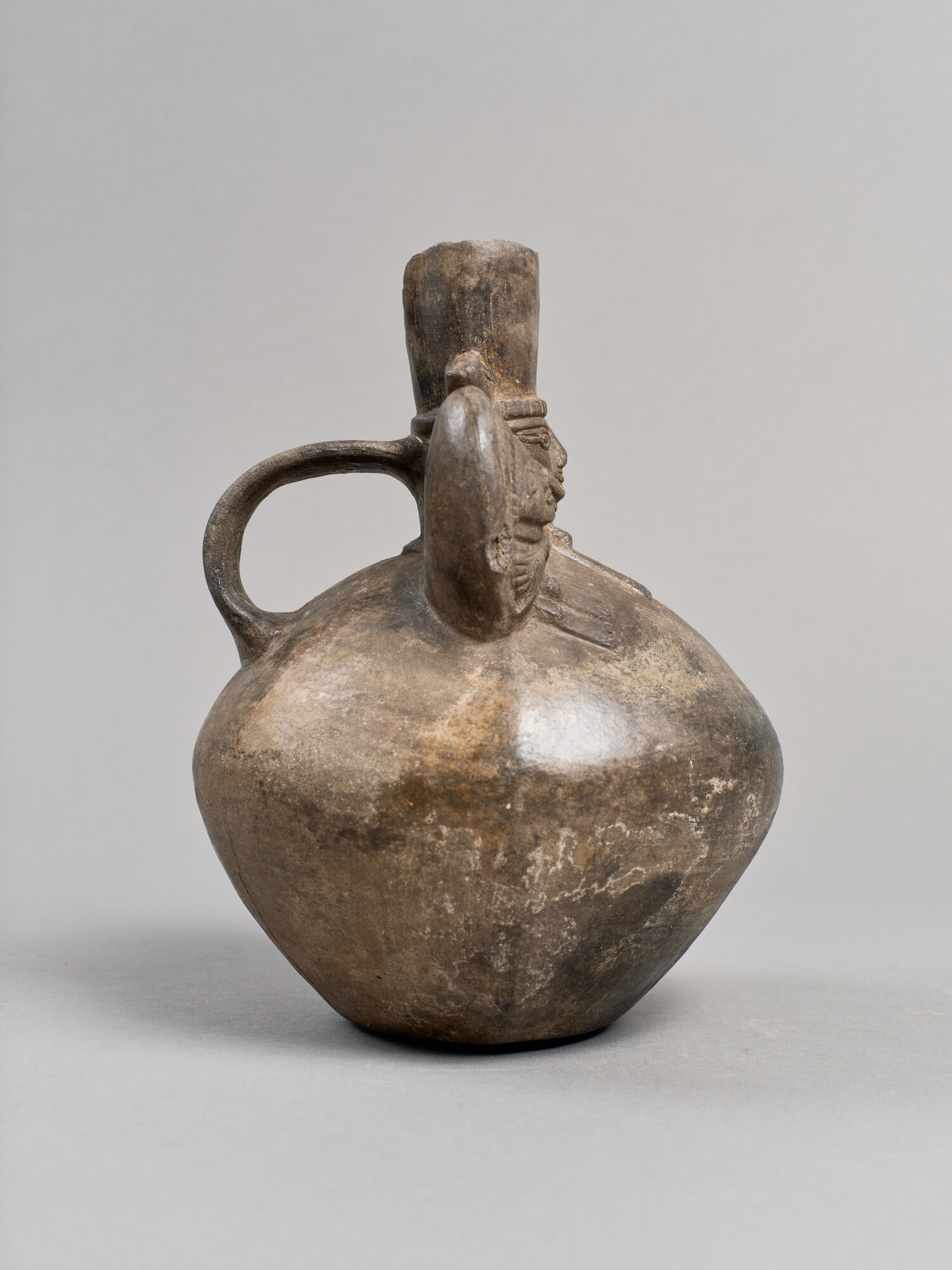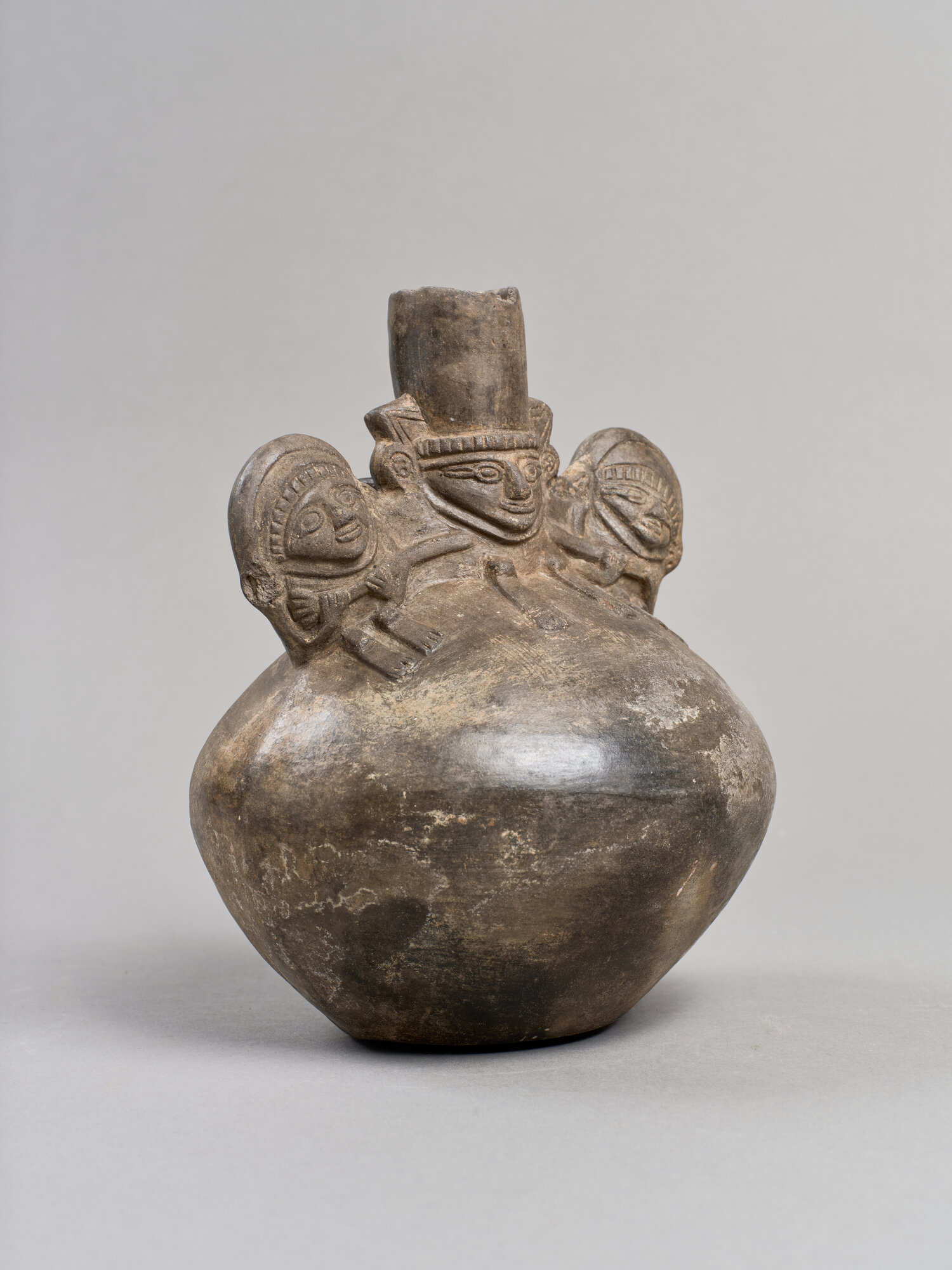 Vaso-bottiglia globulare di colore grigio, con il fondo piatto e l'ansa posteriore nastriforme. La camera carenata è sormontata da tre personaggi maschili: il personaggio centrale, di alto rango, è caratterizzato dai tratti del volto a rilievo e presenta rocchetti auricolari discoidali incisi, fascia frontale a rilievo e incisa e un alto copricapo che costituisce il collo cilindrico del vaso. Sui lati due personaggi maschili, con i tratti del volto a rilievo e copricapo semilunato, reggono la portantina su cui siede il personaggio centrale. Gli arti inferiori dei tre personaggi sono a rilievo sulla spalla del vaso