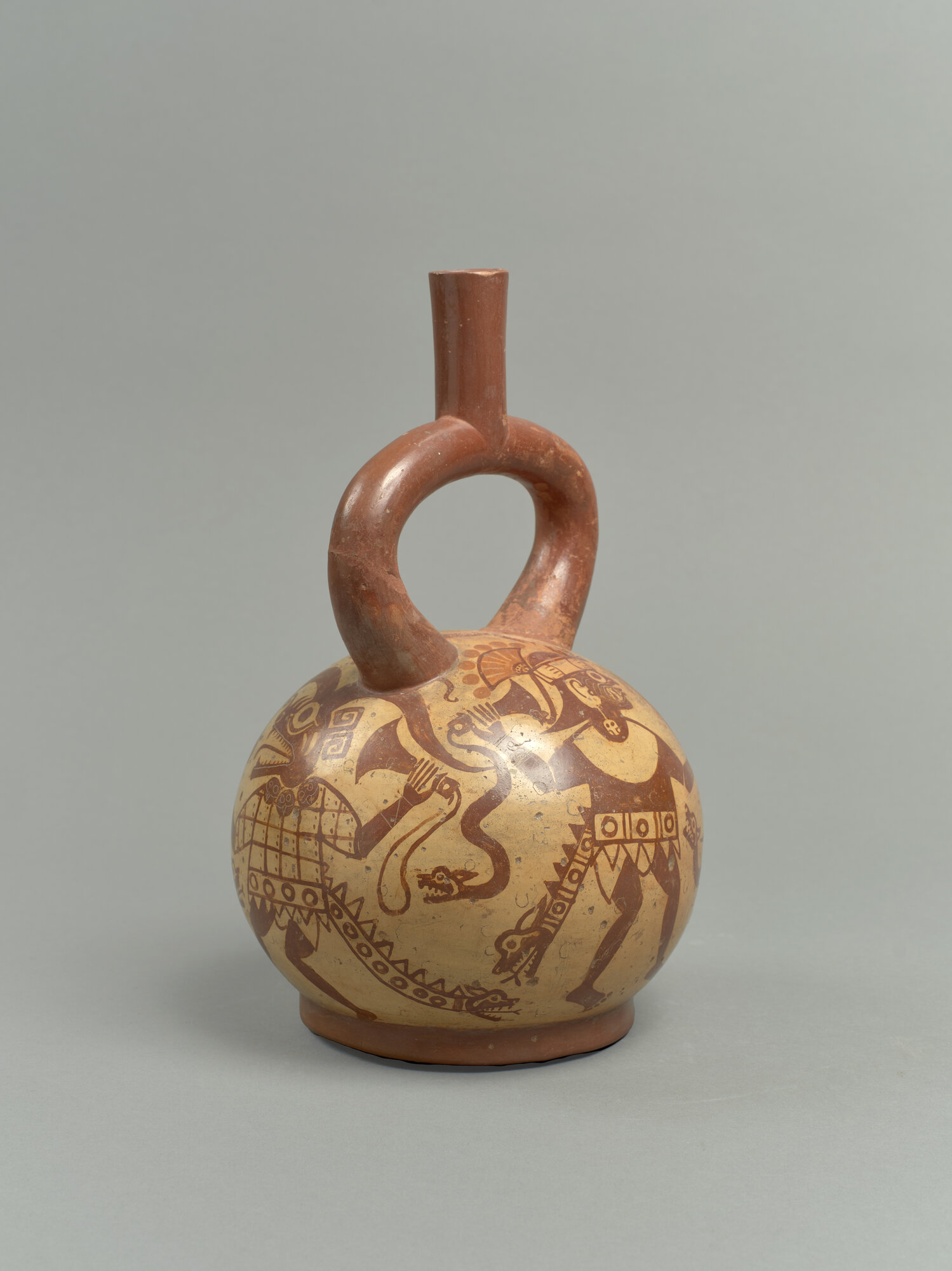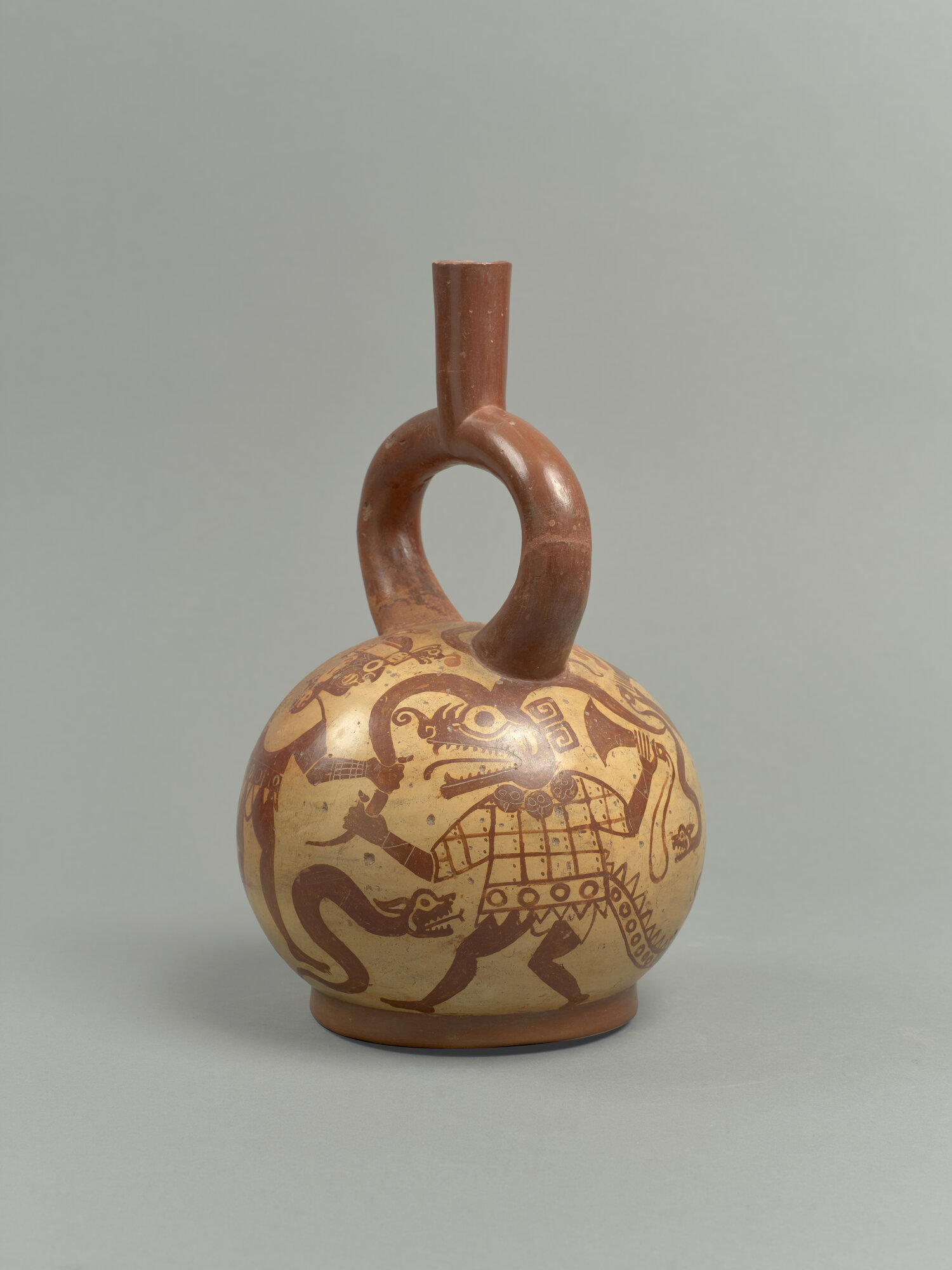 Il vaso, dalla forma a fiasco, con il piede a disco distinto e il fondo piatto, è di colore rosso, arancio e crema. Il corpo globulare è dipinto con figure serpentiformi rosse e una scena di lotta tra personaggi mitologici e creature fantastiche alternate sullo sfondo color crema. I particolari delle decorazioni sono incisi sulla superficie. I due personaggi maschili di profilo, identificati come l'eroe mitologico Ai-Pec, brandiscono con una mano un tumi e afferrano con l'altra uno dei due tentacoli che partono dalla testa delle figure antropozoomorfe. Ognuno dei due uomini indossa un perizoma decorato a motivi geometrici terminante in una "coda" serpentiforme crestata, un pettorale, un pendente auricolare e un copricapo a fascia decorato con testa di felino e piume (?) a ventaglio color arancio. I due esseri fantastici indossano una camicia decorata a reticolato e un perizoma; anch'essi brandiscono un tumi e trattengono il tentacolo afferrato dall'eroe