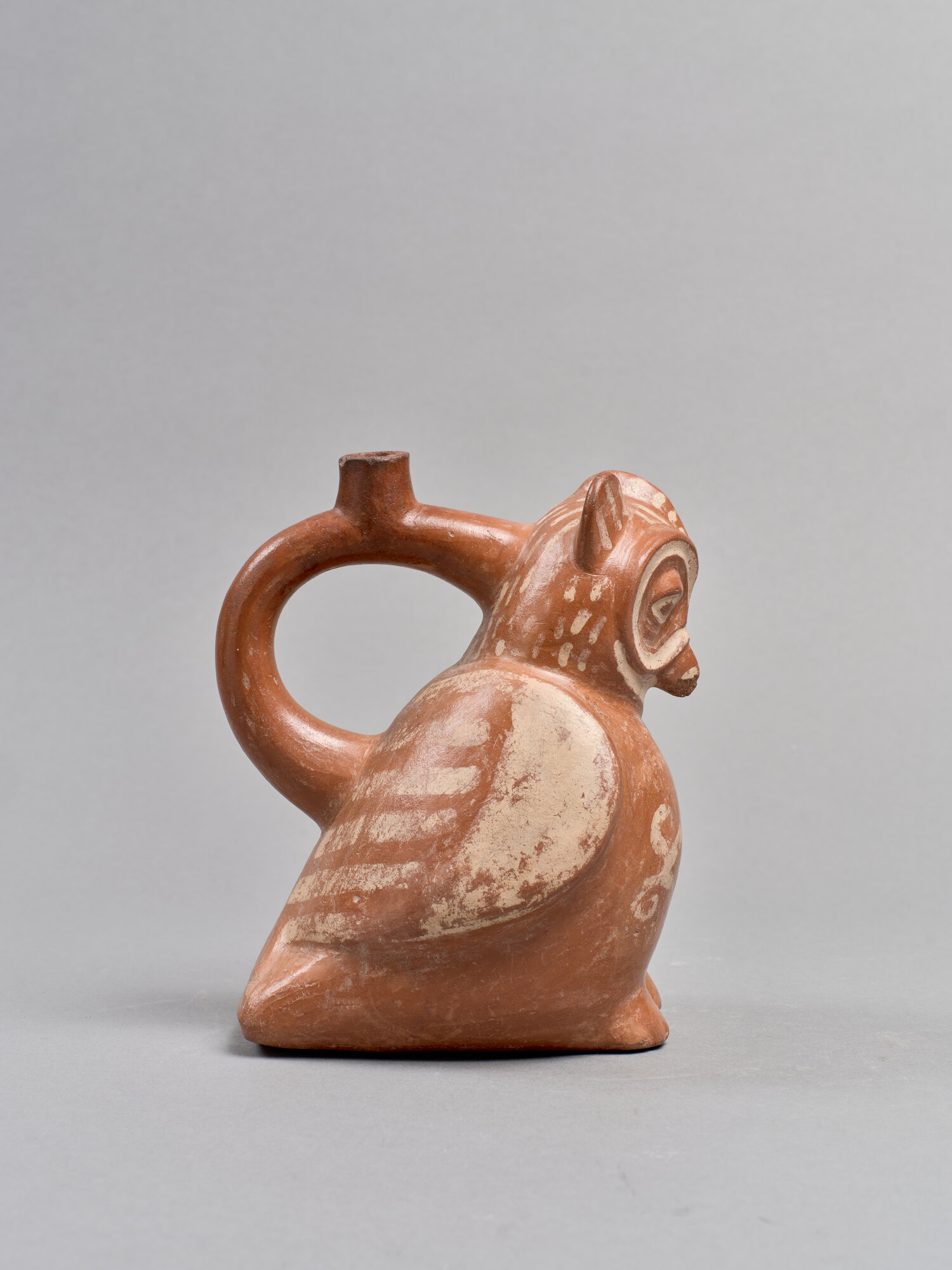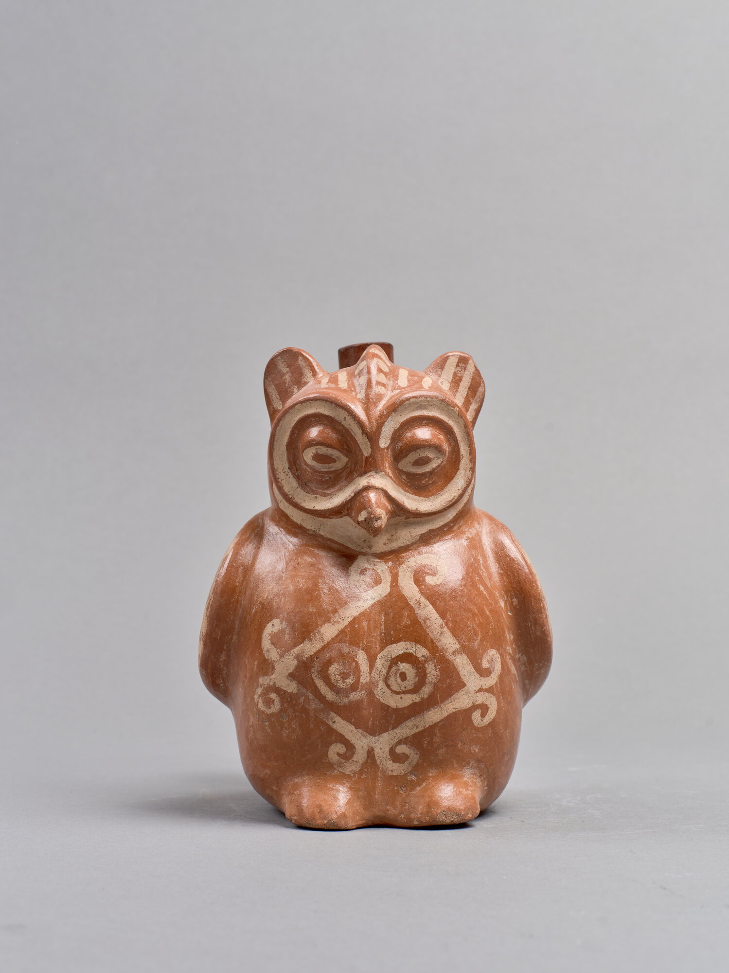 Vaso di colore rosso aranciato e crema dal fondo piatto. La camera, modellata a forma di civetta, presenta decorazioni sul petto a volute e cerchi concentrici. Il contorno degli occhi e il piumaggio sono dipinti in color crema