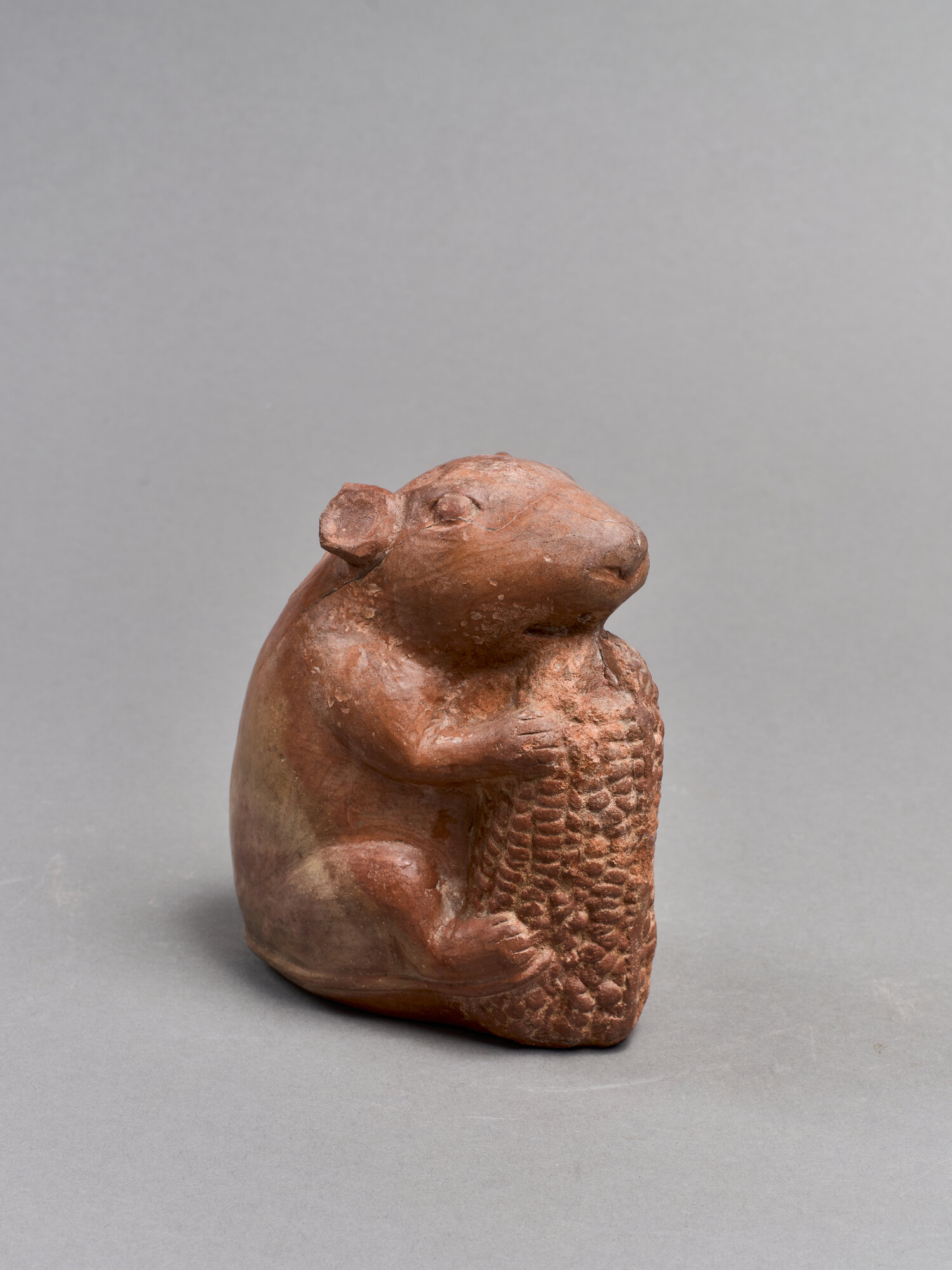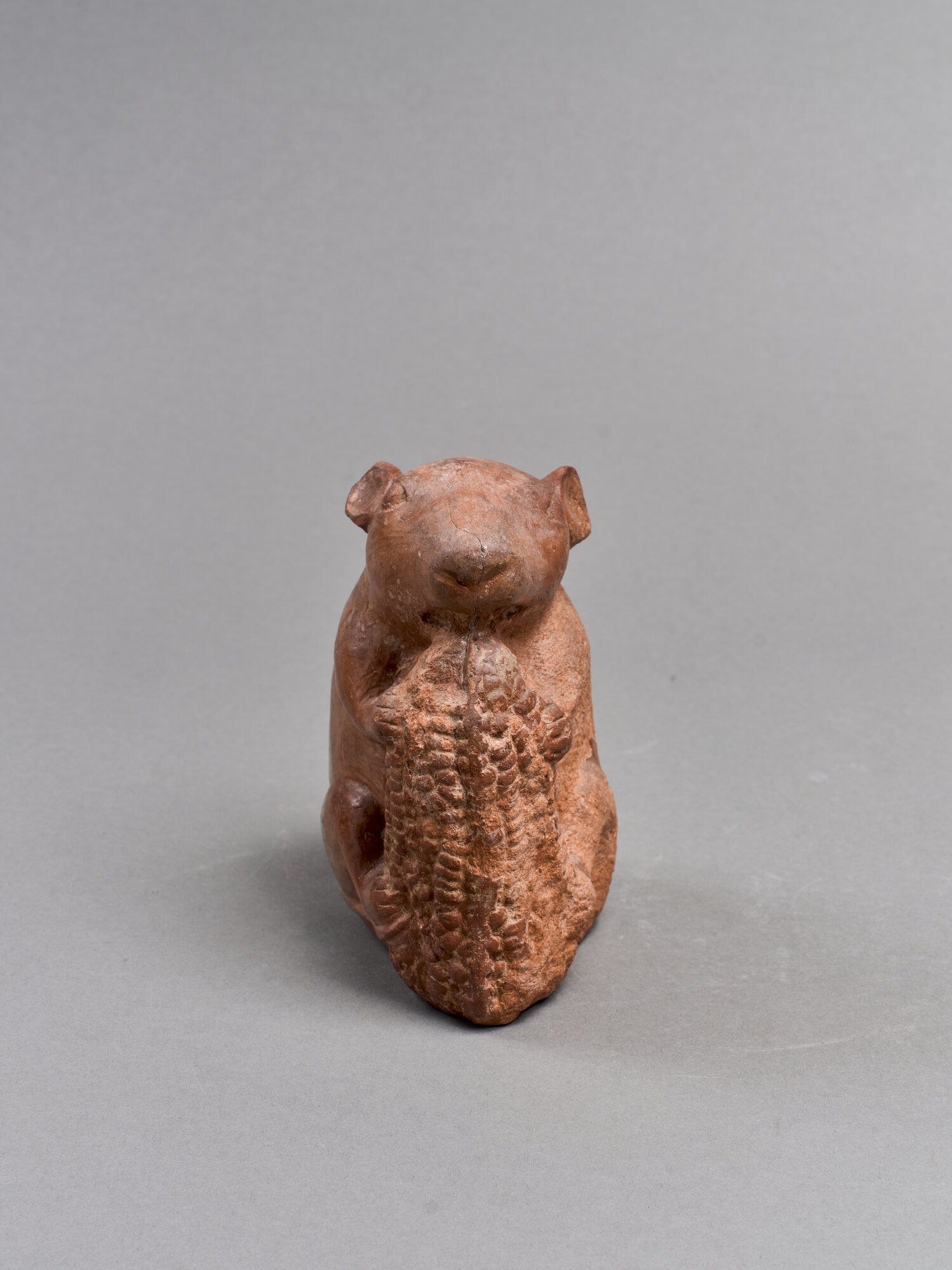 Vaso zoomorfo di colore rosso aranciato e con il fondo piatto. La camera è a forma di nutria, accovacciata nell'atto di mangiare una pannocchia di mais tenuta tra le zampe. Le orecchie sono modellate a tutto tondo, gli occhi circolari hanno le palpebre incise